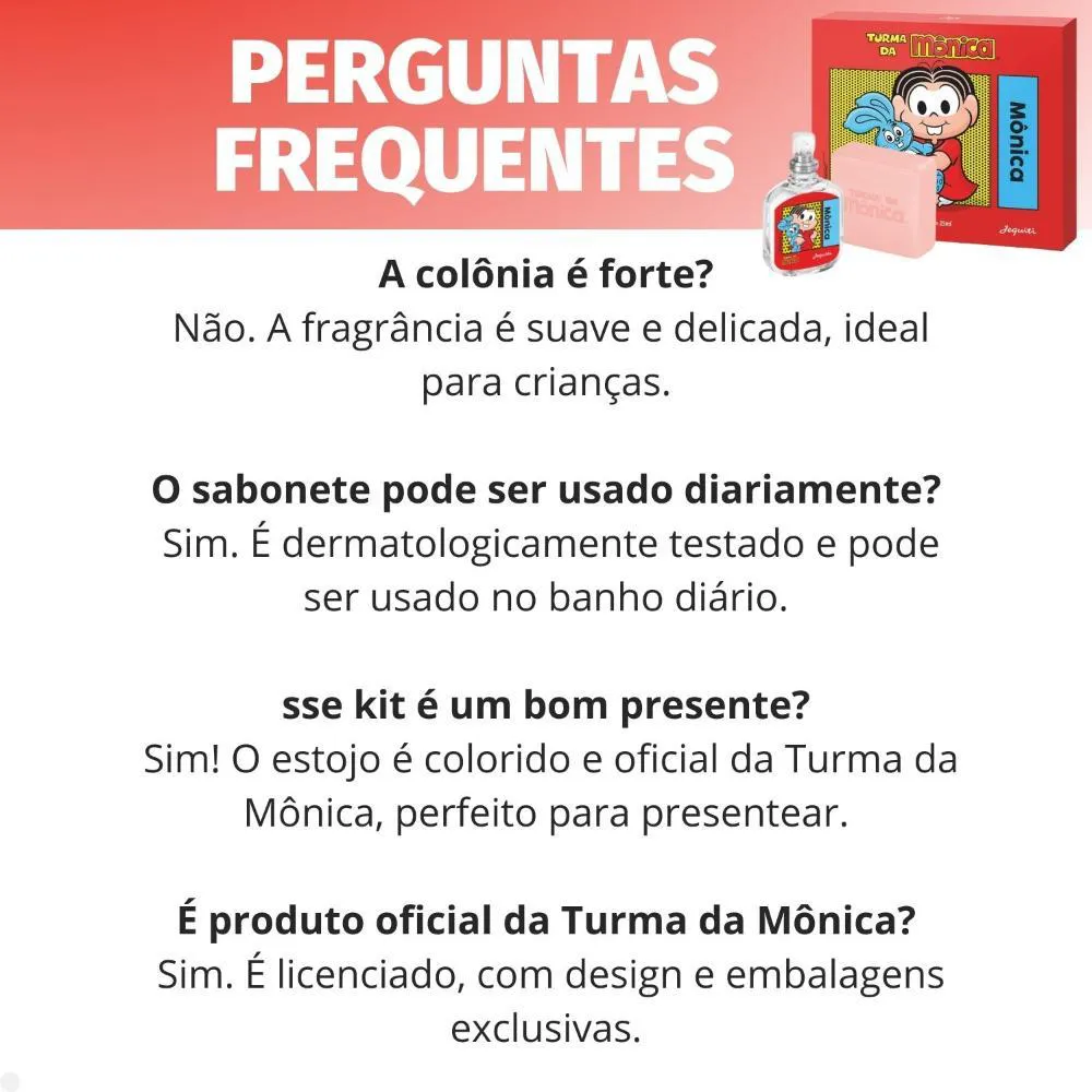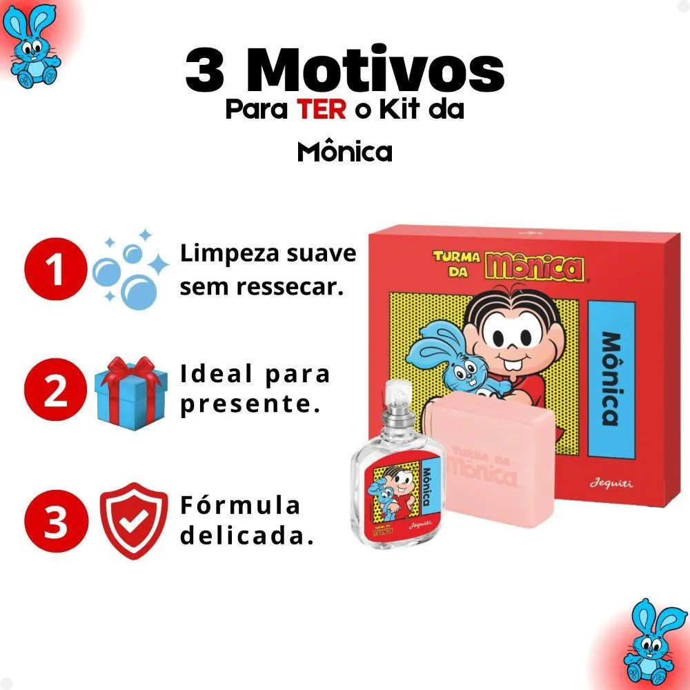 Produto oficialmente licenciado da Turma da Mônica, garantindo autenticidade e qualidade.Desenvolvido pela renomada marca JEQUITI, sinônimo de confiança em cosméticos.Conjunto completo com Colônia 25ml e Sabonete 80g, oferecendo cuidado integral.Apresentado em um charmoso Estojo Mônica, perfeito para colecionar e organizar.Ocasiões de Uso e Cenários Ideais