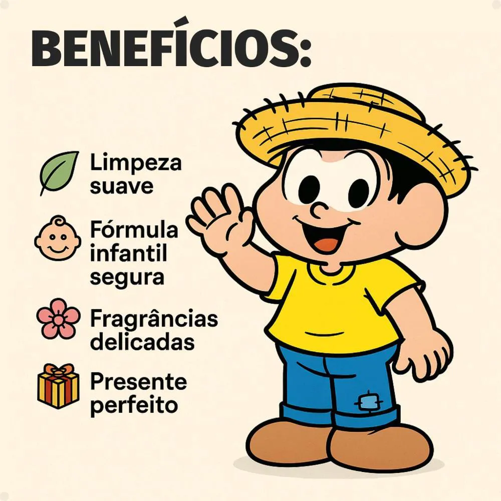 Proporciona uma limpeza suave e eficaz para a pele, removendo impurezas sem ressecar.Transforma a hora do banho em um momento lúdico e agradável, incentivando a higiene pessoal das crianças.Ideal para incentivar a higiene pessoal das crianças com seus personagens favoritos, tornando o banho mais divertido.Oferece uma experiência de cuidado com a qualidade JEQUITI, garantindo segurança e bem-estar.Deixa a pele delicadamente perfumada com a fragrância suave da Turma do Chico Bento.Diferenciais do Produto