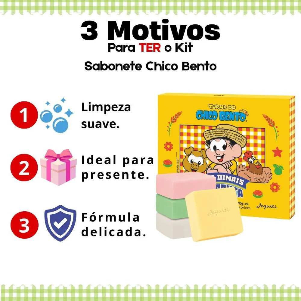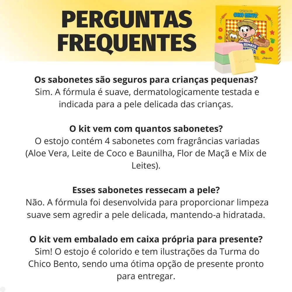 Produto oficial da Turma do Chico Bento, garantindo autenticidade e carinho em cada detalhe.Estojo exclusivo com 4 sabonetes, perfeito para colecionar, presentear ou variar as fragrâncias no dia a dia.Desenvolvido pela JEQUITI, sinônimo de qualidade e confiança em cosméticos infantis.Fórmula suave e dermatologicamente testada, ideal para a pele delicada das crianças.Embalagem divertida e colorida que estimula a imaginação e a alegria dos pequenos.Ocasiões de Uso e Cenários Ideais