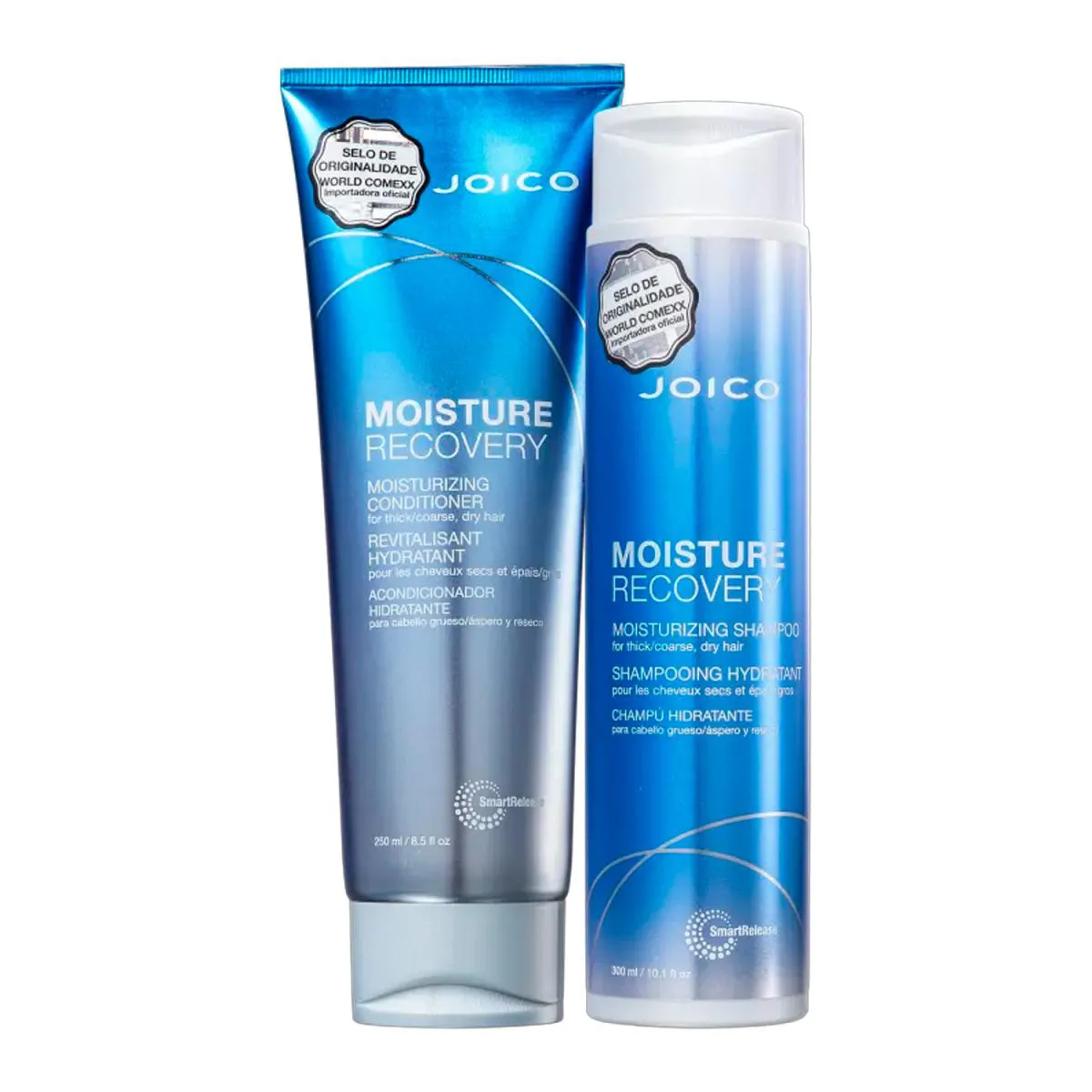 Kit com shampoo e condicionador para cabelos secos. Kit Joico Moisture Recovery Smart Release, tratamento que limpa, nutre e hidrata instantaneamente. O Kit Joico Moisture Recovery Smart Release conta com uma fórmula poderosa que garante máxima recuperação e hidratação em cada fio, revitaliza e proporciona maciez e maleabilidade. Contém: Joico Moisture Recovery Smart Release - Shampoo 300ml: conta com um blend exclusivo de extratos botânicos marinho que deixa o seu cabelo mais leve e macio através da reparação da barreira hidrolipídica e restauração da maleabilidade do fio; Joico Moisture Recovery Smart Release - Condicionador 250ml: promove 24 horas de intensa hidratação, revitalizando os fios secos e ressecados de forma instantânea e com resultado duradouro.