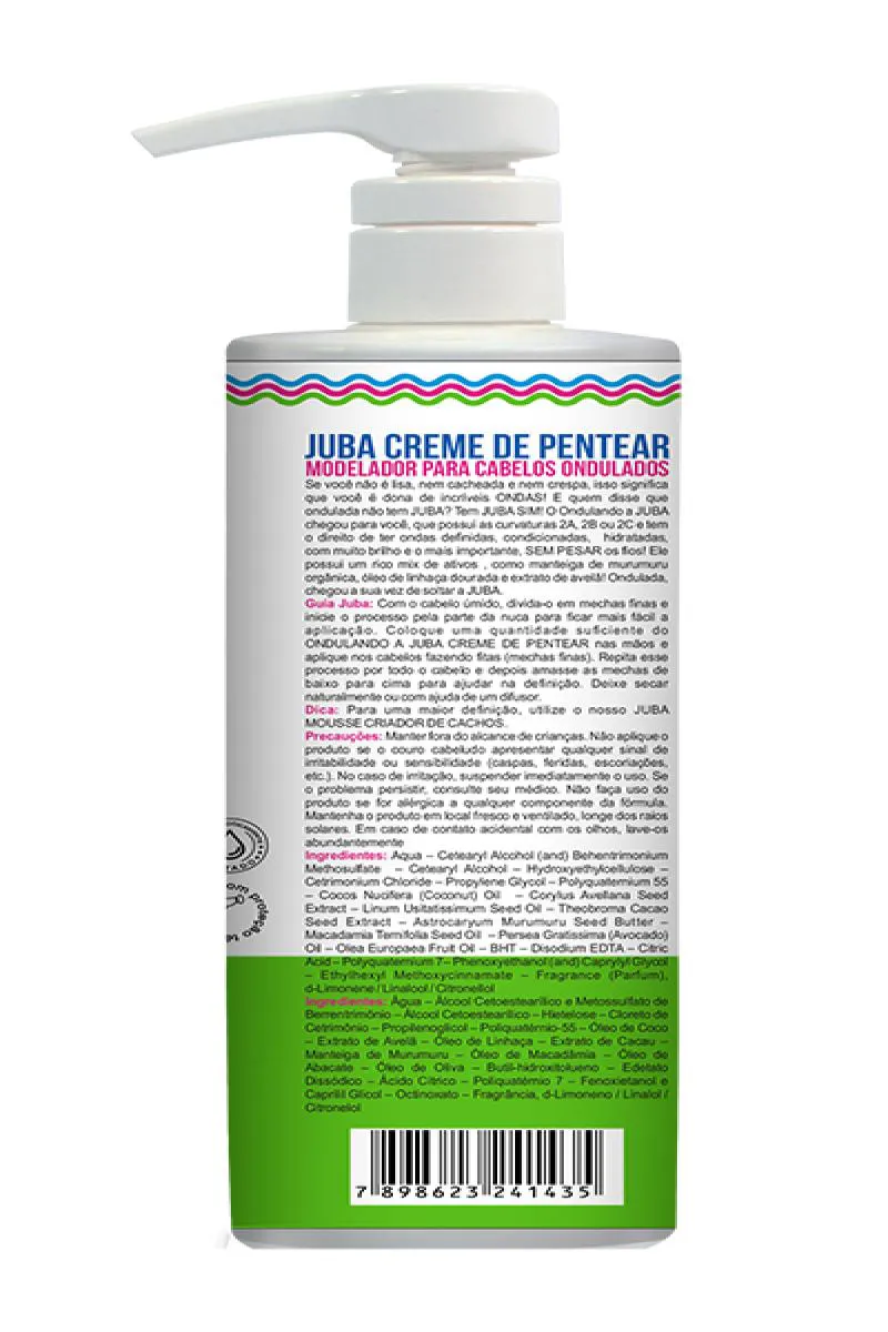 Se você não é lisa, nem cacheada e nem crespa, isso significa que você é dona de incríveis ONDAS! E quem disse que ondulada não tem JUBA? Tem JUBA SIM! O Ondulando a JUBA chegou para você, que possui as curvaturas 2A, 2B ou 2C e tem o direito de ter ondas definidas, hidratadas, com muito brilho e o mais importante, SEM PESAR os fios! Ele possui um rico mix de ativos , como manteiga de murumuru orgânica, óleo de linhaça dourada e extrato de avelã! Ondulada, chegou a sua vez de soltar a JUBA.Guia Juba: Com o cabelo úmido, divida-o em mechas finas e inicie o processo pela parte da nuca para ficar mais fácil a aplicação. Coloque uma quantidade suficiente do ONDULANDO A JUBA CREME DE PENTEAR nas mãos e aplique nos cabelos fazendo fitas (mechas finas). Repita esse processo por todo o cabelo e depois amasse as mechas de baixo para cima para ajudar na definição. Deixe secar naturalmente ou com ajuda de um difusor.