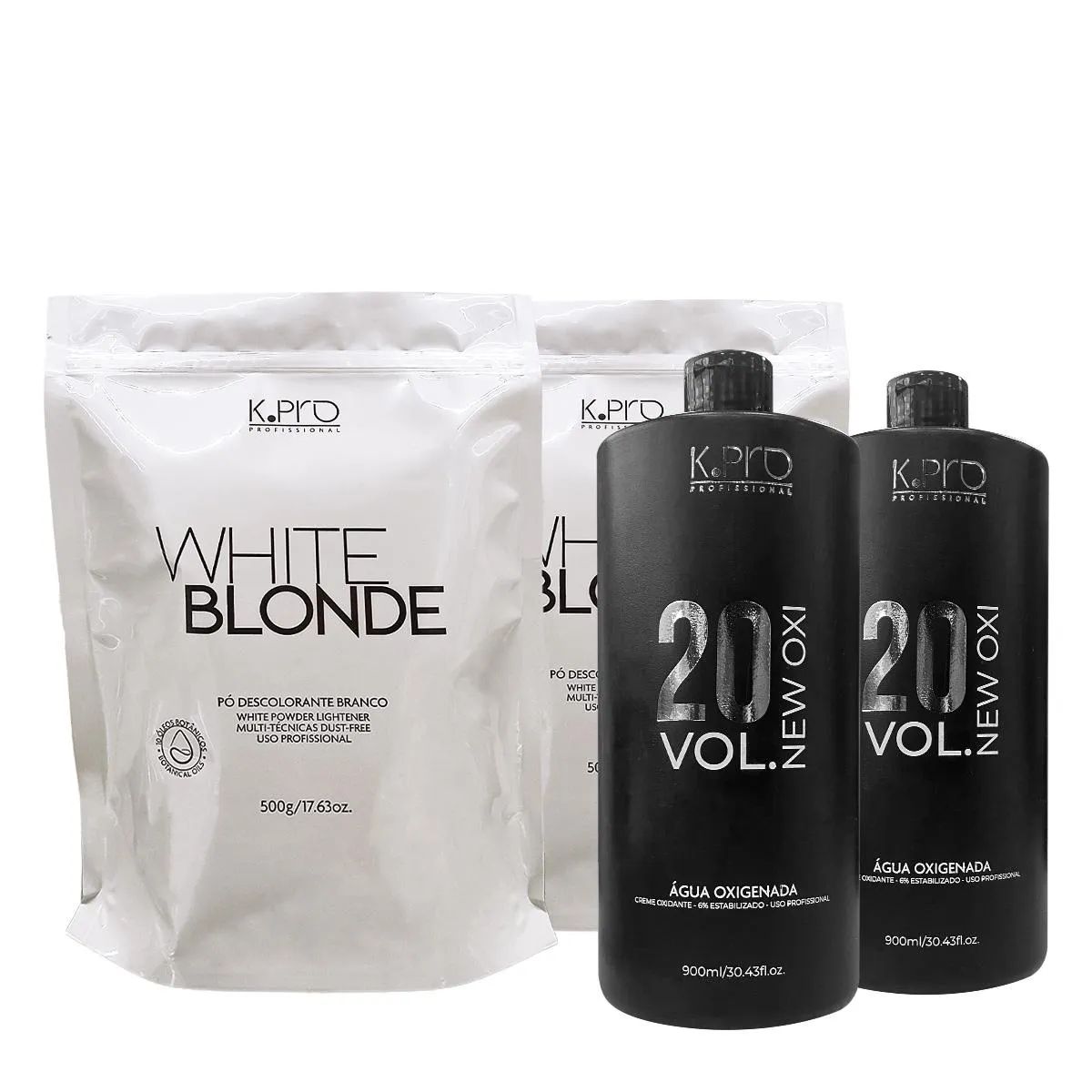 K.Pro New Oxi 6% - Oxidante 20 Volumes 900ml (2 unidades): O K.Pro Profissional Oxidante New OX 20 Volumes é um creme para ser utilizado no preparo de colorações e descolorações para cabelos. Ele garante uma mistura homogênea e de fácil aplicação.K.Pro White Blonde Multi-técnicas - Pó Descolorante Branco 500g (2 unidades): O Pó Descolorante White Blonde é Dust Free (evita a suspensão do pó) e de alta performace.