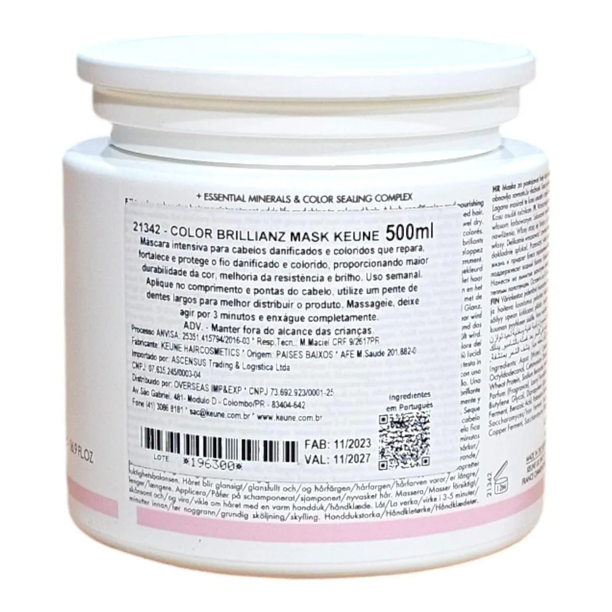 Keune Color Brillianz - Máscara Capilar 500ml: máscara para cabelos com coloração. Restauração e proteção dos fios e fixação e estabilização da cor. Hidrata e restaura os cabelos coloridos que ficam luminosos e com cor viva por mais tempo. Oferece proteção contra os danos da exposição ao sol, nutrição e evita o desbotamento.