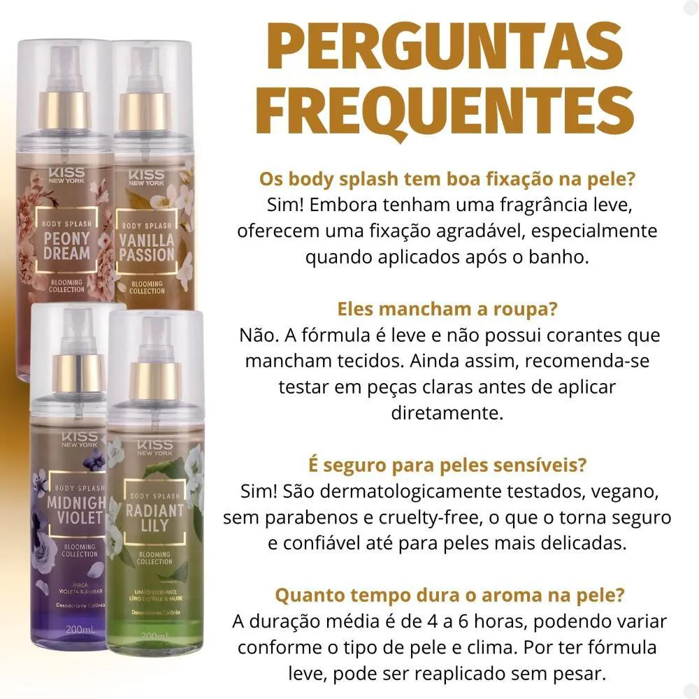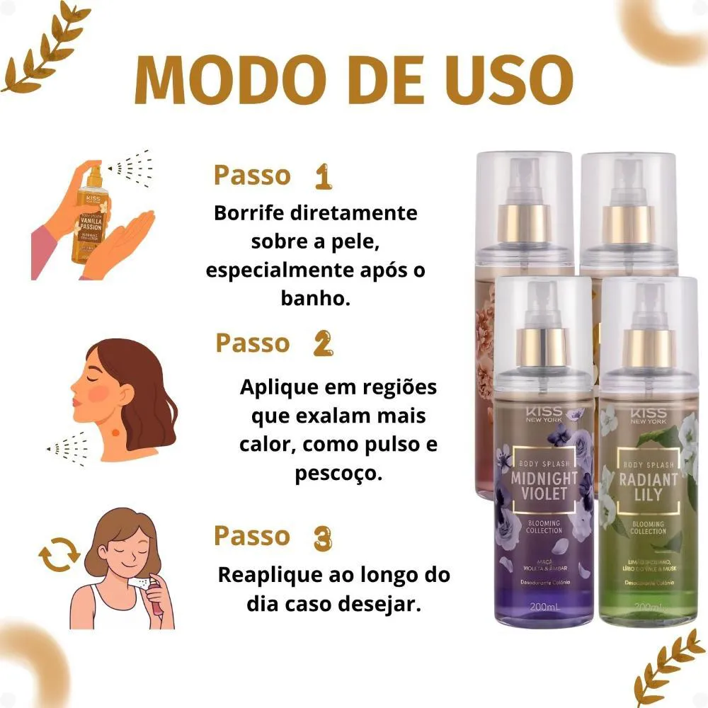 Marca: KISS NEW YORKProduto: Kit Kiss New York Body Splash Blooming Collection: Peony Dream, Vanilla Passion, Midnight Violet e Radiant LilyTipo de Produto: Body SplashColeção: Blooming CollectionFragrâncias: Peony Dream (frutal floral sofisticada com notas de champagne, peônia e sândalo), Radiant Lily (cítrica floral almiscarada com notas de limão siciliano, lírio do vale e musk), Midnight Violet (floral frutal oriental com notas de maçã, violeta e âmbar), Vanilla Passion (oriental gourmand com notas de bergamota, baunilha e caramelo)Volume por Unidade: 200 mlUnidades no Kit: 4Público-alvo: UnissexCruelty-Free: SimVegano: SimCategoria: Kits de Produtos CorporaisAnvisa:Peony Dream 25351052136/2025-11Vanilla Passion 25351052135/2025-68Midnight Violet 25351051853/2025-17Radiant Lily 25351051854/2025-61