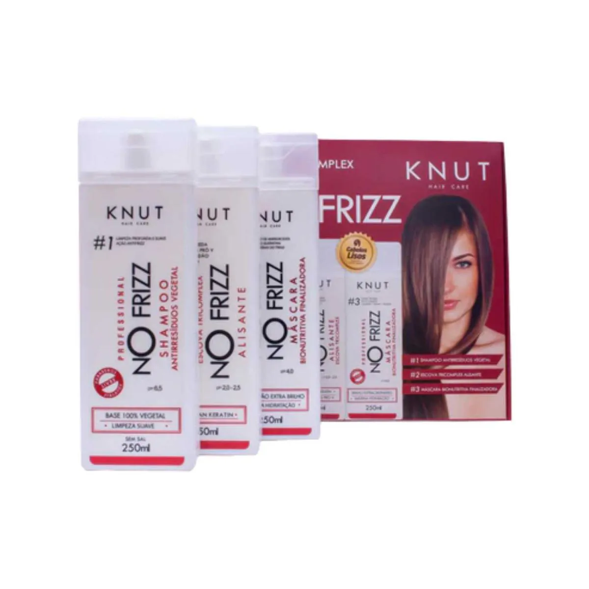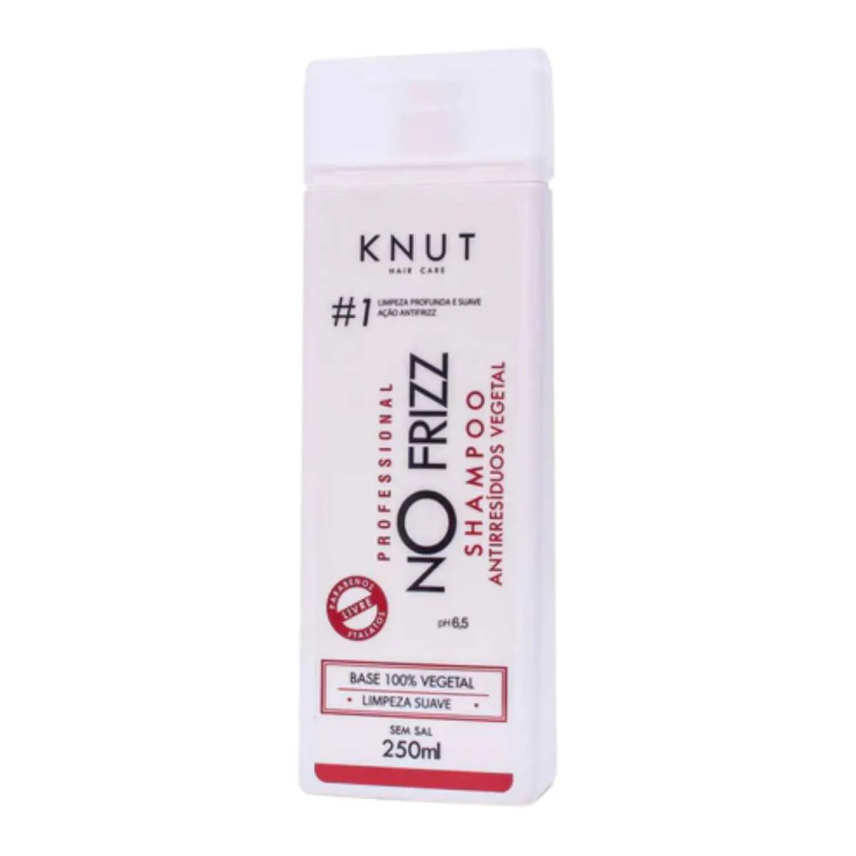 Não contém Formol. Contém: KNUT No Frizz - shampoo Antirresíduo 250ml: remove as impurezas sem danificar os fios.
