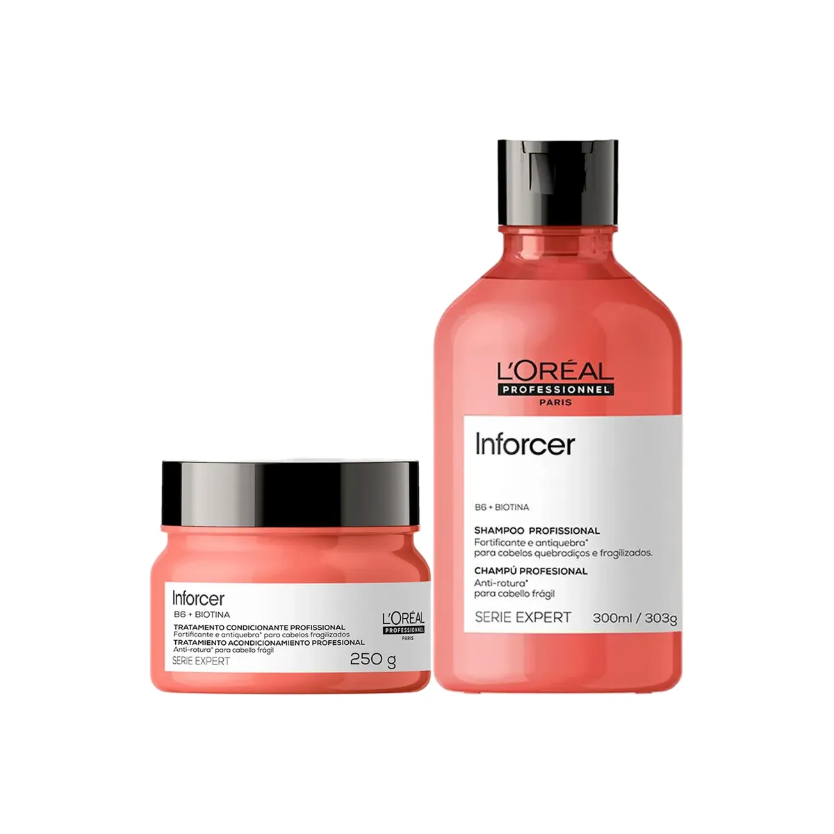 O Kit Inforcer L'Oréal Professionnel Shampoo Antiquebra + Máscara Capilar de Tratamento foi especialmente desenvolvido para tratar cabelos fracos, frágeis e danificados. O shampoo fortalece a fibra capilar desde a raiz, reduzindo a quebra e promovendo o crescimento saudável, enquanto a máscara nutre profundamente a fibra capilar, estimulando o crescimento saudável e deixando os cabelos visivelmente mais resistentes e saudáveis.