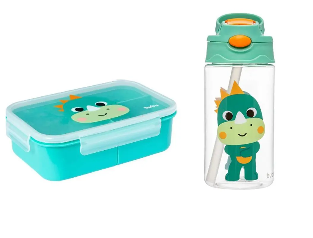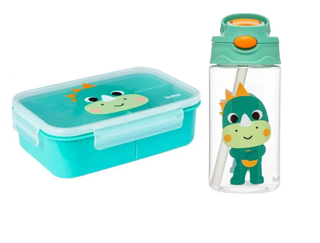 Kit Lanche Garrafinha 450Ml + Bento Lunchbox com Divisórias Dino Zoo Buba