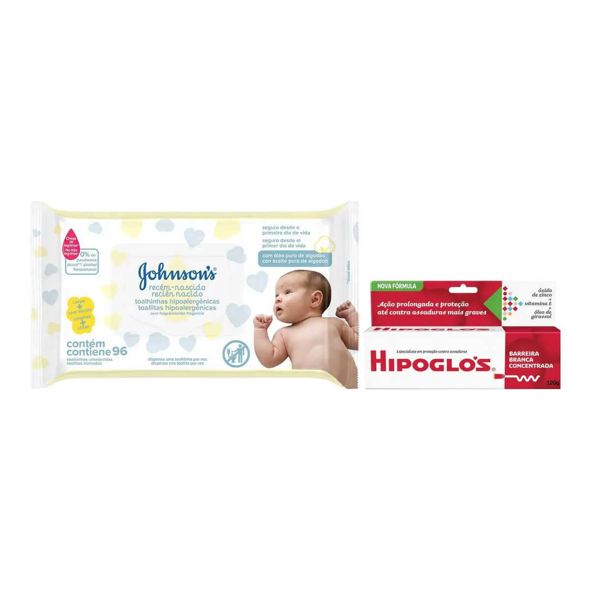 Kit Lenço Umedecido Johnson's Baby Recém-Nascido 96 unidades + Creme para Assaduras Hipoglós Original 120g