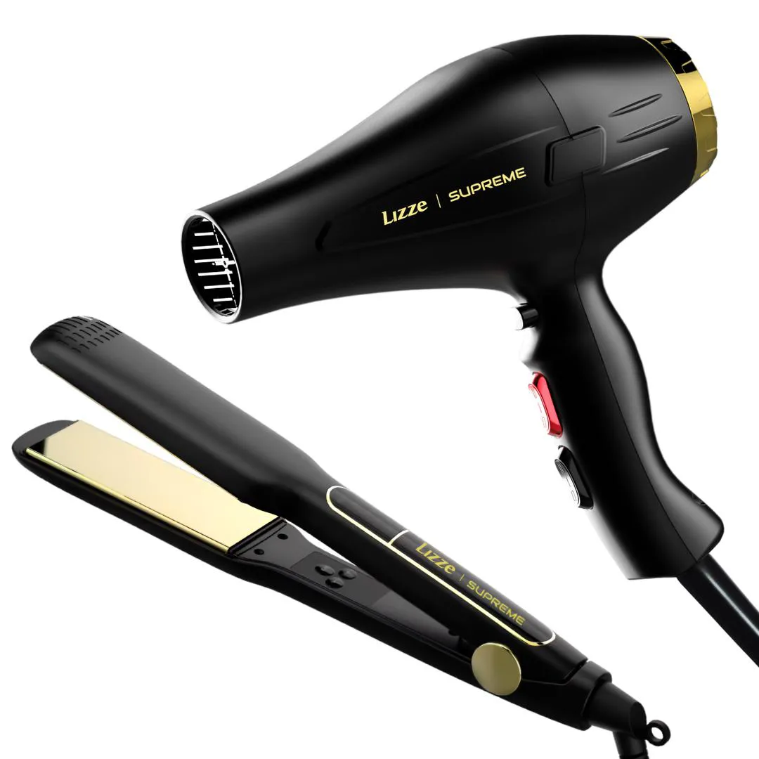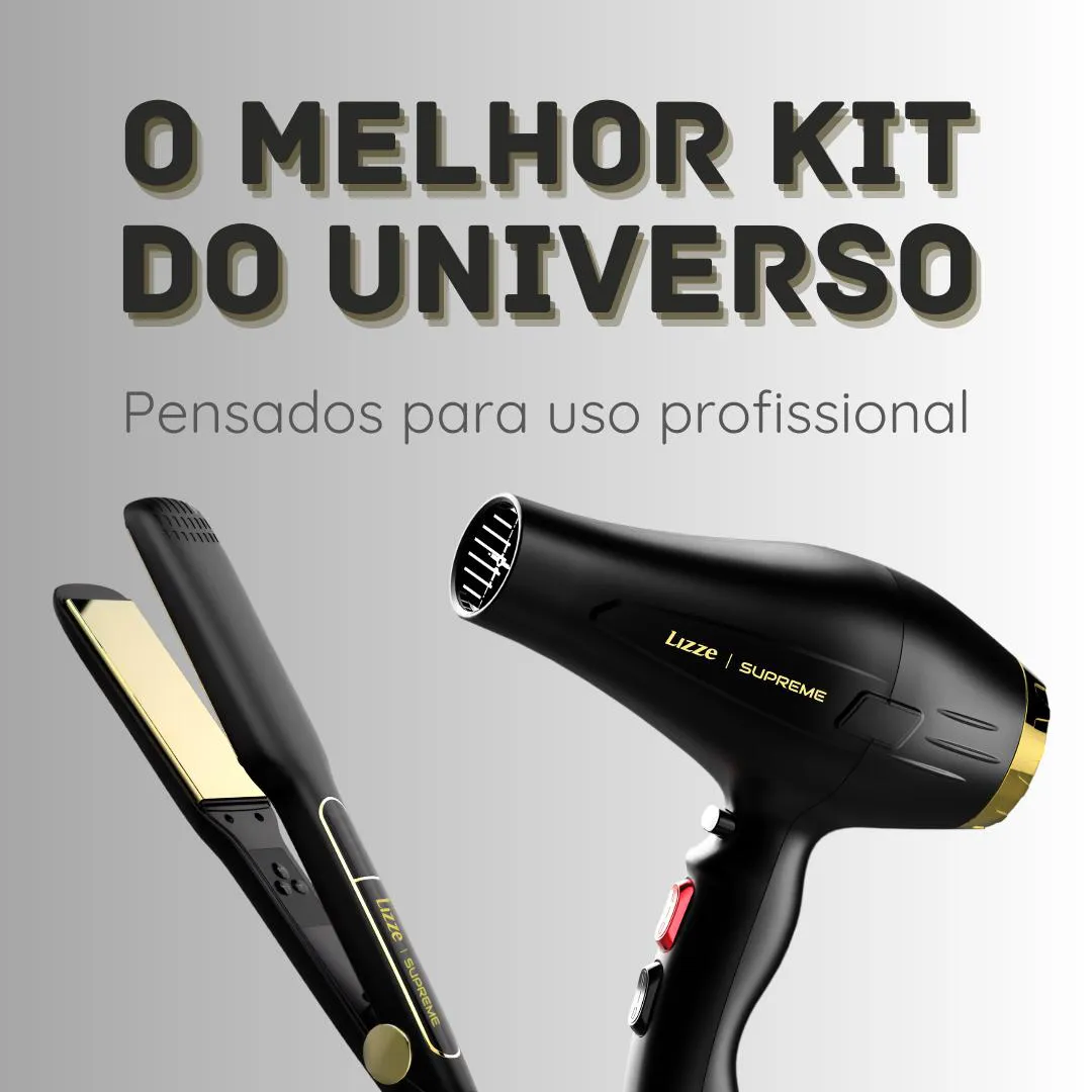 KIT PROFISSIONAL LIZZE SUPREME: ALISAMENTO E SECAGEM POTENTES EM TEMPO RECORDE! O Kit Profissional Lizze Supreme combina a Prancha para cabelo Lizze Supreme 252ºC e o Secador de Cabelo Lizze Supreme 2600W para oferecer uma experiência completa em styling capilar. A Prancha Lizze Supreme destaca-se por suas placas de titânio de 40mm com tecnologia Nano Titanium, que garantem aquecimento uniforme até 252°C (485°F) e permitem alisar o dobro de cabelo por passada, reduzindo o tempo de trabalho pela metade. O gabinete resistente não descasca com o uso, e o cabo giratório de 2,7m oferece liberdade de movimento para penteados precisos. Já o Secador Lizze Supreme possui 2600W de potência e jato de ar a 180°C, com velocidade de 18m/s, ideal para secagem rápida e eficiente. Seu design profissional inclui dois bicos para controle direcional do ar e cabo de 3m com plug 20A, garantindo segurança e praticidade em salões ou uso doméstico. Ambos os produtos são voltados para profissionais que buscam alta produtividade e resultados impecáveis, com garantia de 6 meses do fabricante e certificação de segurança. Prancha Lizze Supreme 252ºC: