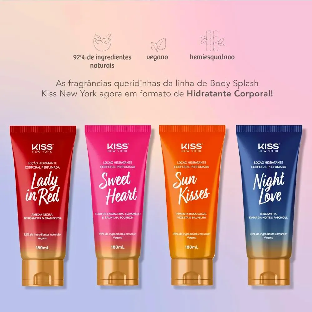 Kit Loção Corporal hidratante Kiss New York - 4 Fragrâncias As fragrâncias queridinhas da linha de Body Splash Kiss New York agora em formato de Hidratante Corporal! A Loção Hidratante Corporal da Kiss New York contém hemiesqualano, ativo que proporciona hidratação intensa e prolongada, fórmula vegana e feita com 92% de ingredientes naturais. Utilize a loção e o body splash juntos para potencializar e prologara fixação da fragrância.