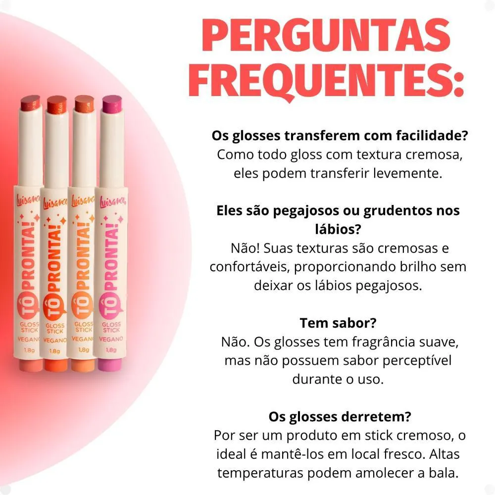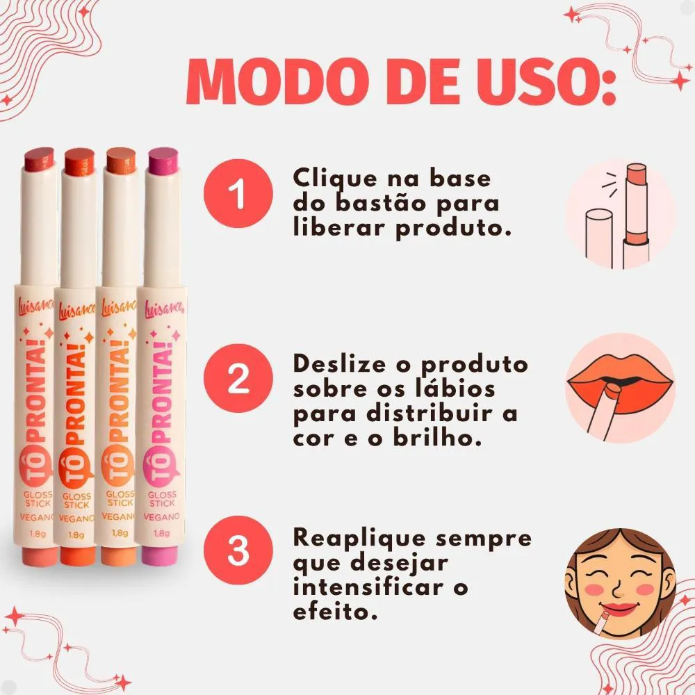 O Kit Contém: - 1 Gloss Stick Tô Pronta Arrasei L1120 - 1 Gloss Stick Tô Pronta Que Tudo L1120 - 1 Gloss Stick Tô Pronta Ta Sabendo? L1120 - 1 Gloss Stick Tô Pronta Tô On! L1120