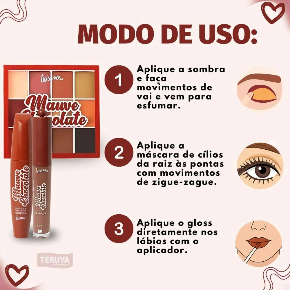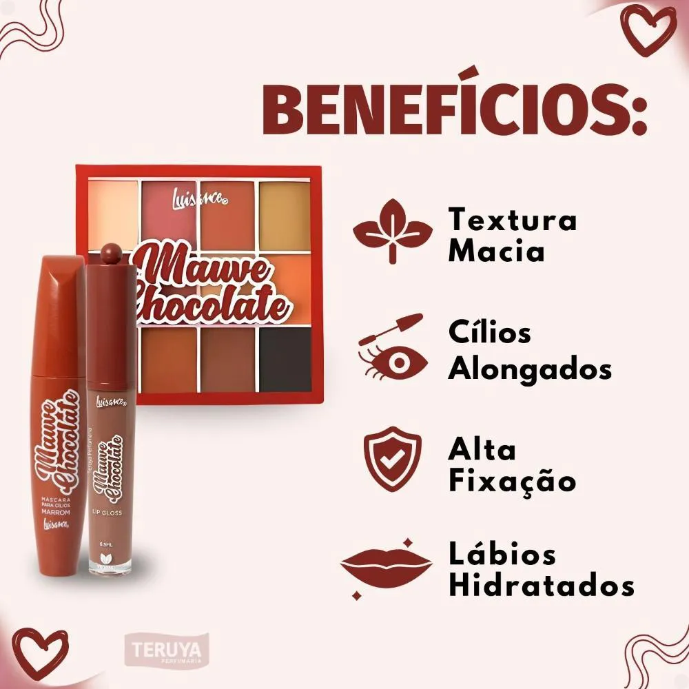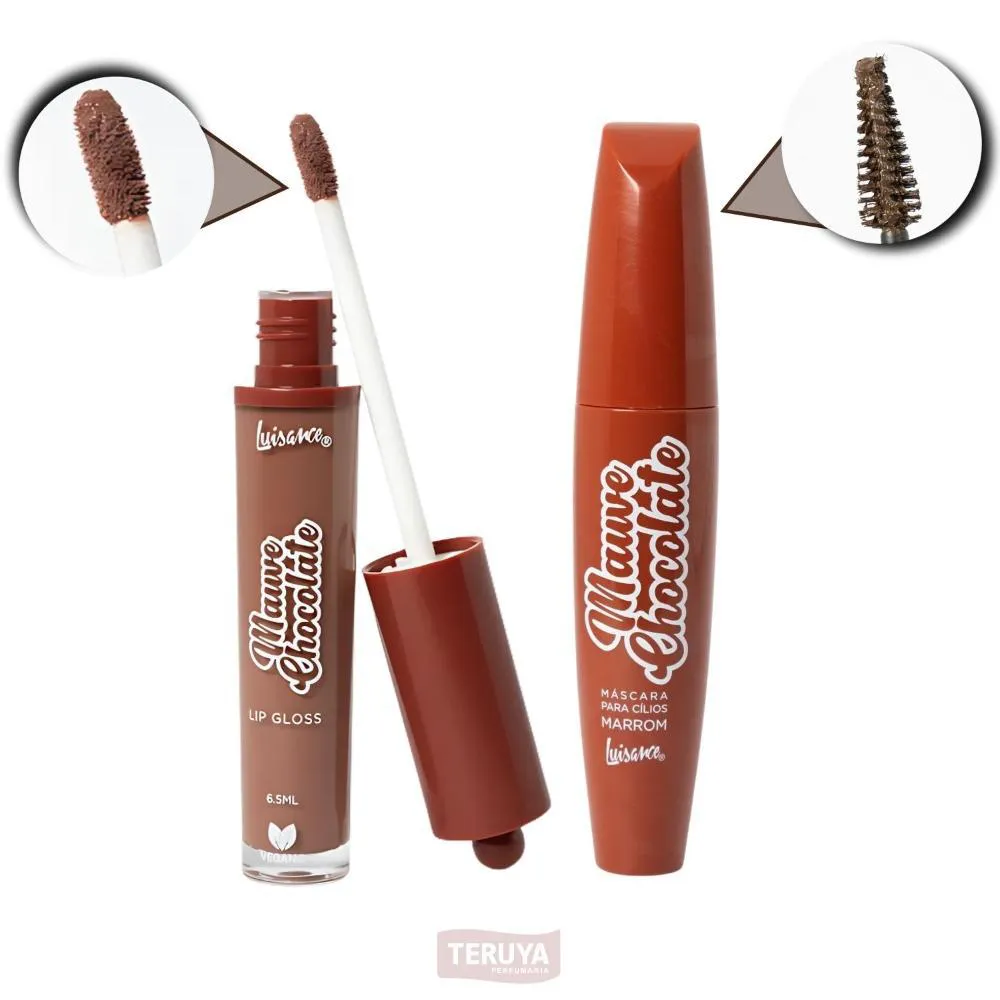 Kit Luisance Mauve Chocolate: Paleta de sombras , máscara para cílios Marrom e Lip gloss Cor 01
