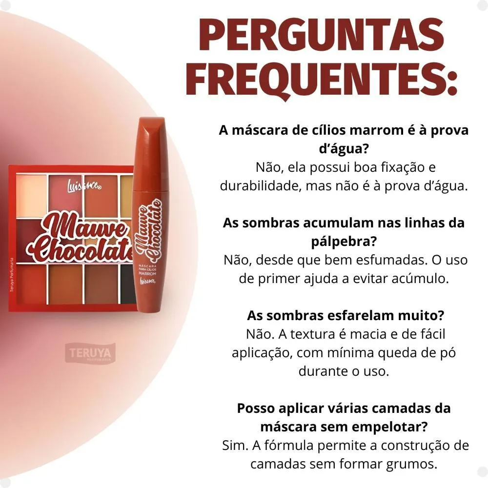 Kit Contém: 1 Paleta de Sombras Mauve Chocolate (12 cores, acabamentos matte, acetinado e brilhante)1 Máscara para Cílios Mauve Chocolate (Cor Marrom, 12ml, efeito alongamento e volume)Anvisa:2531.864436/2023-75(máscara para cílios)Anvisa :25351.449160/2023-07(sombra matte) Anvisa:25351.449222/2023-72(sombra 3D)