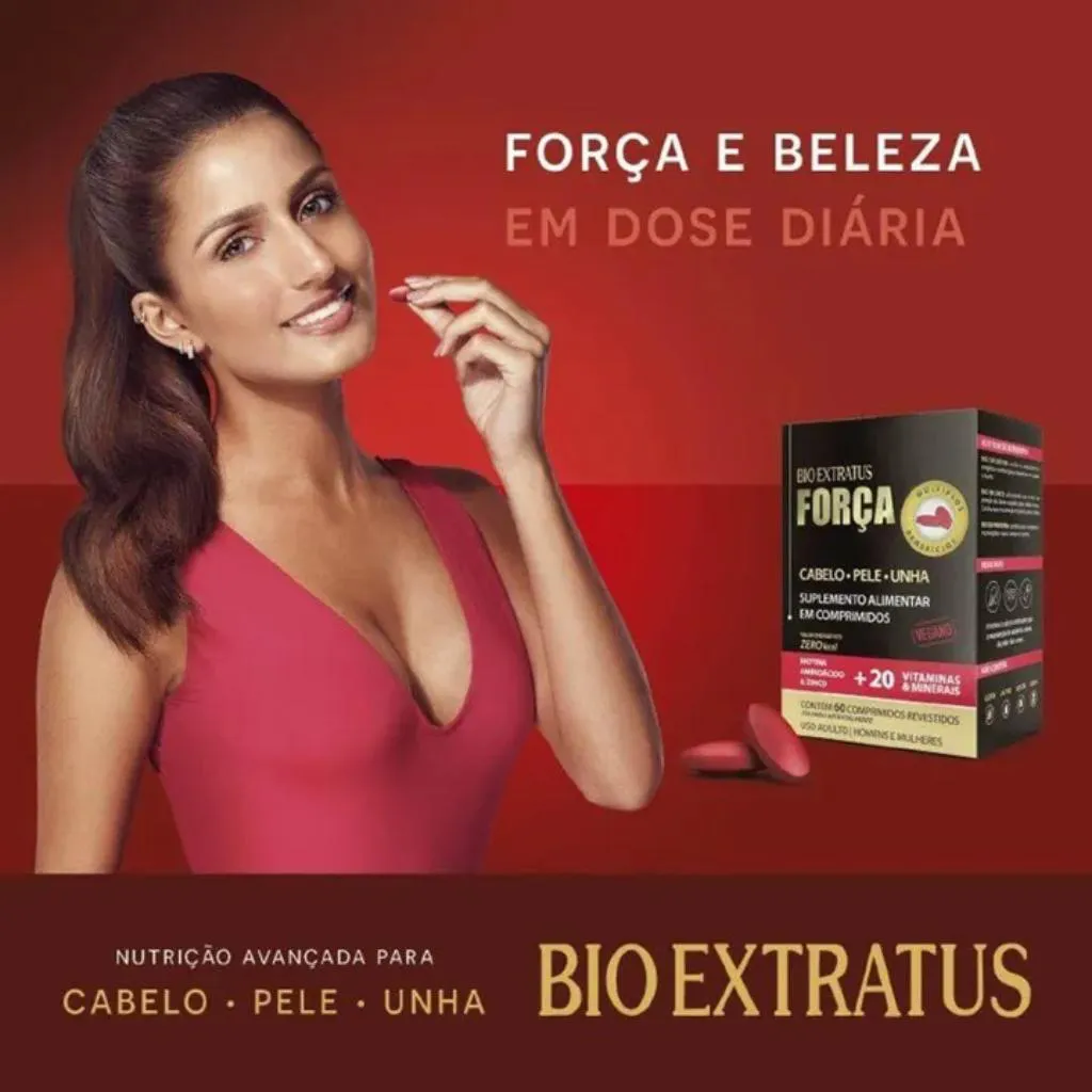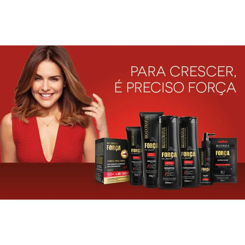 Somos a Só Beleza, é um prazer tê-lo como cliente. Oferecemos a você produtos Originais e acompanhados de Nota Fiscal, com o envio máximo de 24 h úteis. Estamos disponíveis para esclarecermos dúvidas ou auxiliarmos na sua compra. Kit com máscara e suplemento para cabelos enfraquecidos - BIO EXTRATUS Bio Extratus Força com Pimenta Salon Duo proporciona hidratação, força, brilho e crescimento. O Kit Bio Extratus Força com Pimenta Salon Duo apresenta fórmula inovadora que devolve o brilho, a força e a vitalidade aos fios enfraquecidos. Sua formulação uniu a tecnologia exclusiva Bioxyl às propriedades da pimenta, que ativa a circulação sanguínea para estimular o crescimento do cabelo. Tudo isso somado ao poder reconstrutor da microqueratina. Contém: Bio Extratus Força com Pimenta - Suplemento alimentar com 60 cápsulas Bio Extratus Força com Pimenta - Máscara Capilar 250G: promove uma hidratação fortalecedora nos cabelos. Modo de Uso Máscara: Após lavar o cabelo, aplique a Máscara, massageando mecha a mecha. Para intensificar o tratamento use touca de hidratação. Deixe agir de 3 a 5 minutos. Enxágue. O Suplemento Alimentar Bio Extratus Força tem uma fórmula exclusiva que concentra alto teor de Zinco e Biotina, além de ser enriquecido com Aminoácido, Vitaminas e minerais, trazendo multibenefícios para seu organismo. Possui ação estimulante e nutritiva, atuando no fortalecimento dos fios e capacidade de reparação e ação nutritiva. Ativa o brilho e a maciez dos cabelos danificados, aumentando a vascularização da derme, reduzindo os fios em queda e aumentando os que estão crescendo. Também aumenta a densidade e o comprimento dos fios. Ingerir 1 cápsula por dia. A ingestão logo pela manhã é mais recomendada, pois o organismo estará mais propenso à absorção dos nutrientes. Mas pode ser usado de acordo com a rotina de cada pessoa. Testado dermatologicamente