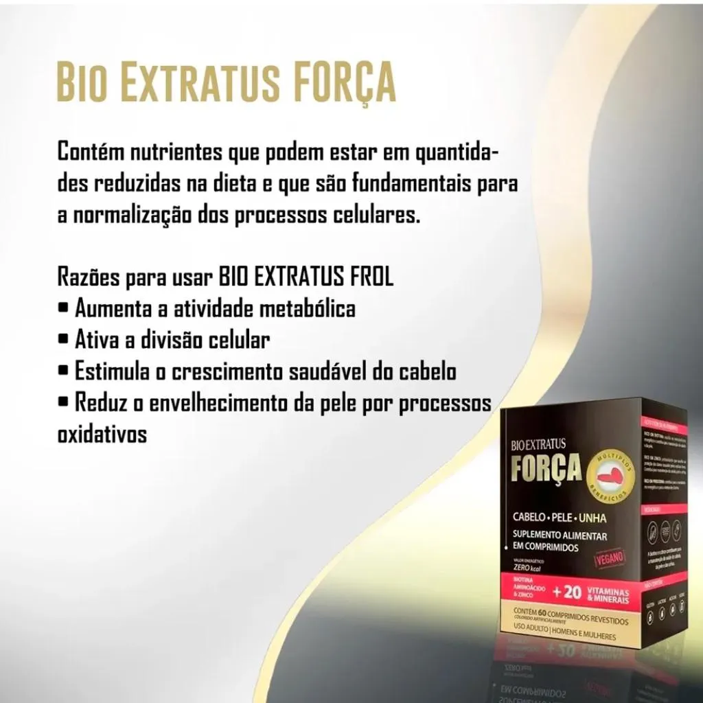Somos a Só Beleza, é um prazer tê-lo como cliente. Oferecemos a você produtos Originais e acompanhados de Nota Fiscal, com o envio máximo de 24 h úteis. Estamos disponíveis para esclarecermos dúvidas ou auxiliarmos na sua compra. Kit com máscara e suplemento para cabelos enfraquecidos - BIO EXTRATUS Bio Extratus Força com Pimenta Salon Duo proporciona hidratação, força, brilho e crescimento. O Kit Bio Extratus Força com Pimenta Salon Duo apresenta fórmula inovadora que devolve o brilho, a força e a vitalidade aos fios enfraquecidos. Sua formulação uniu a tecnologia exclusiva Bioxyl às propriedades da pimenta, que ativa a circulação sanguínea para estimular o crescimento do cabelo. Tudo isso somado ao poder reconstrutor da microqueratina. Contém: Bio Extratus Força com Pimenta - Suplemento alimentar com 60 cápsulas Bio Extratus Força com Pimenta - Máscara Capilar 1kg: promove uma hidratação fortalecedora nos cabelos. Modo de Uso Máscara: Após lavar o cabelo, aplique a Máscara, massageando mecha a mecha. Para intensificar o tratamento use touca de hidratação. Deixe agir de 3 a 5 minutos. Enxágue. O Suplemento Alimentar Bio Extratus Força tem uma fórmula exclusiva que concentra alto teor de Zinco e Biotina, além de ser enriquecido com Aminoácido, Vitaminas e minerais, trazendo multibenefícios para seu organismo. Possui ação estimulante e nutritiva, atuando no fortalecimento dos fios e capacidade de reparação e ação nutritiva. Ativa o brilho e a maciez dos cabelos danificados, aumentando a vascularização da derme, reduzindo os fios em queda e aumentando os que estão crescendo. Também aumenta a densidade e o comprimento dos fios. Ingerir 1 cápsula por dia. A ingestão logo pela manhã é mais recomendada, pois o organismo estará mais propenso à absorção dos nutrientes. Mas pode ser usado de acordo com a rotina de cada pessoa. Testado dermatologicamente