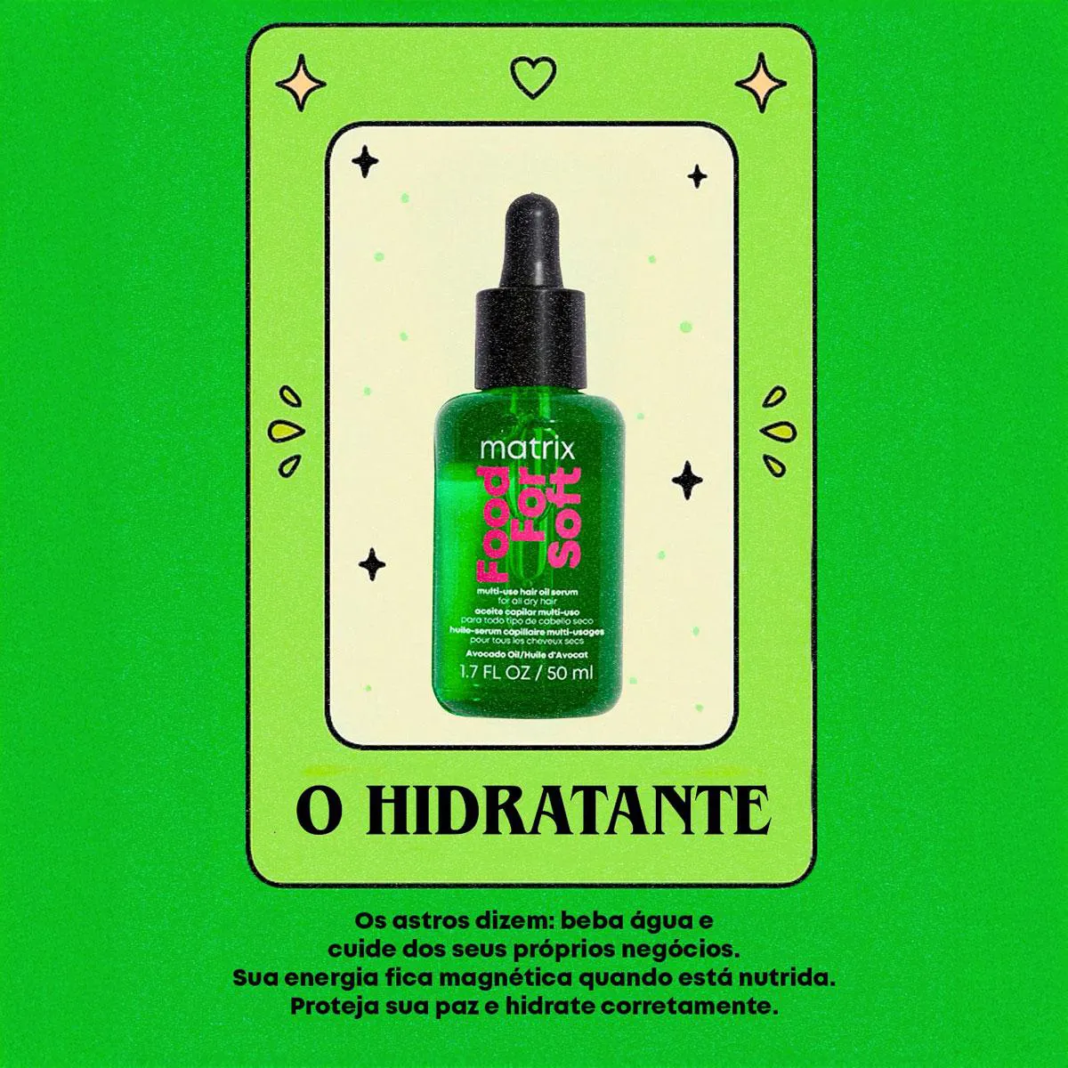 Este Kit Contém Matrix Food for Soft - shampoo 300ml: limpeza delicada, que repõe a hidratação, deixamdo os cabelos lebes e livres de frizz. Com ácido hialurônico e óleo de abacate, a fórmula protege a cor, reduz a porosidade e garante brilho radiante. Matrix Food for Soft - Óleo Capilar 50ml: nutrição profunda e controle imediato dos fios secos. Proporciona hidratação sem pesar, protege contra altas temperaturas (até 233 °C) e mantém os cabelos sedosos, alinhados e livres do frizz por até 72 horas.Conselho de Aplicação