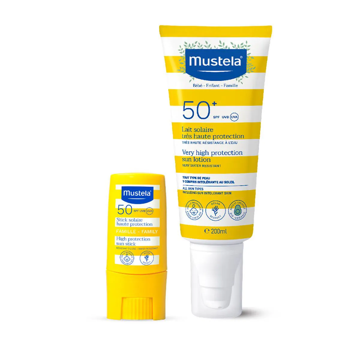 O Kit Protetor Solar Corporal Mustela FPS 50+ Infantil e Adulto Spray 200ml + Protetor Solar Corporal Stick FPS 50 Mustela Infantil 9ml é um conjunto de protetores solares desenvolvidos para a pele de bebês, crianças e adultos, com alta proteção contra os raios UVA e UVB, fórmula hipoalergênica e ingredientes seguros e naturais.