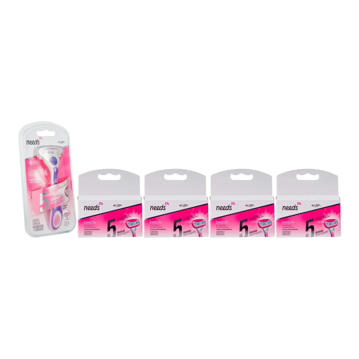Kit Needs Beauty Aparelho de Depilação Recarregável 5 Lâminas 1 Unidade + Carga para Aparelho de Depilação 2 Unidades 4 Caixas