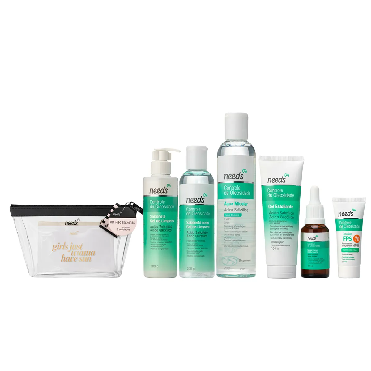 Kit Needs Controle de Oleosidade Gel de Limpeza + Gel Esfoliante + Água Micelar + Protetor Solar FPS70 + Curativo para Acne + Sérum Uniformizador + Tônico Adstringente + Nécessaires