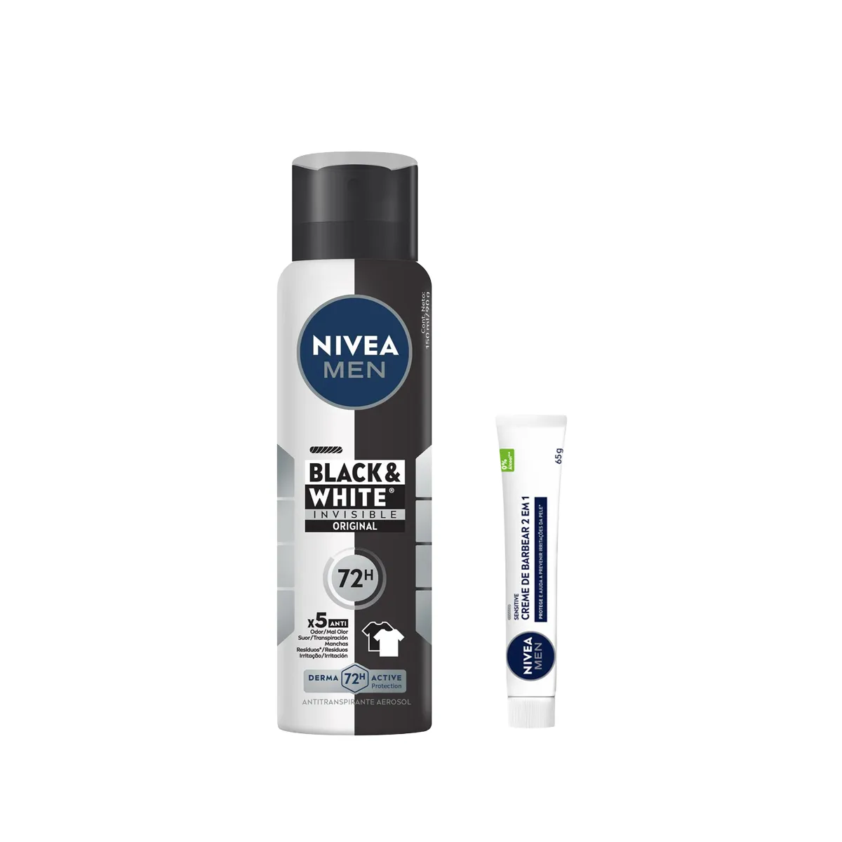 O Kit Nivea Desodorante Antitranspirante Aerosol Men Black & White Invisible + Creme de Barbear Men Sensitive 2 em 1 é um conjunto que oferece proteção antitranspirante por até 72 horas, além de uma fórmula poderosa antibacteriana que elimina 99,99% das bactérias causadoras do mau odor e uma tecnologia inovadora que protege as fibras dos tecidos, evitando manchas brancas nas roupas e o surgimento de manchas amarelas. O creme de barbear Nivea Men Sensitive 2 em 1 é desenvolvido especialmente para a pele do homem e também para a pele mais sensível, oferecendo um deslizamento mais suave na lâmina com tecnologia Active Comfort que promove proteção e ajuda a prevenir a irritação da pele.
