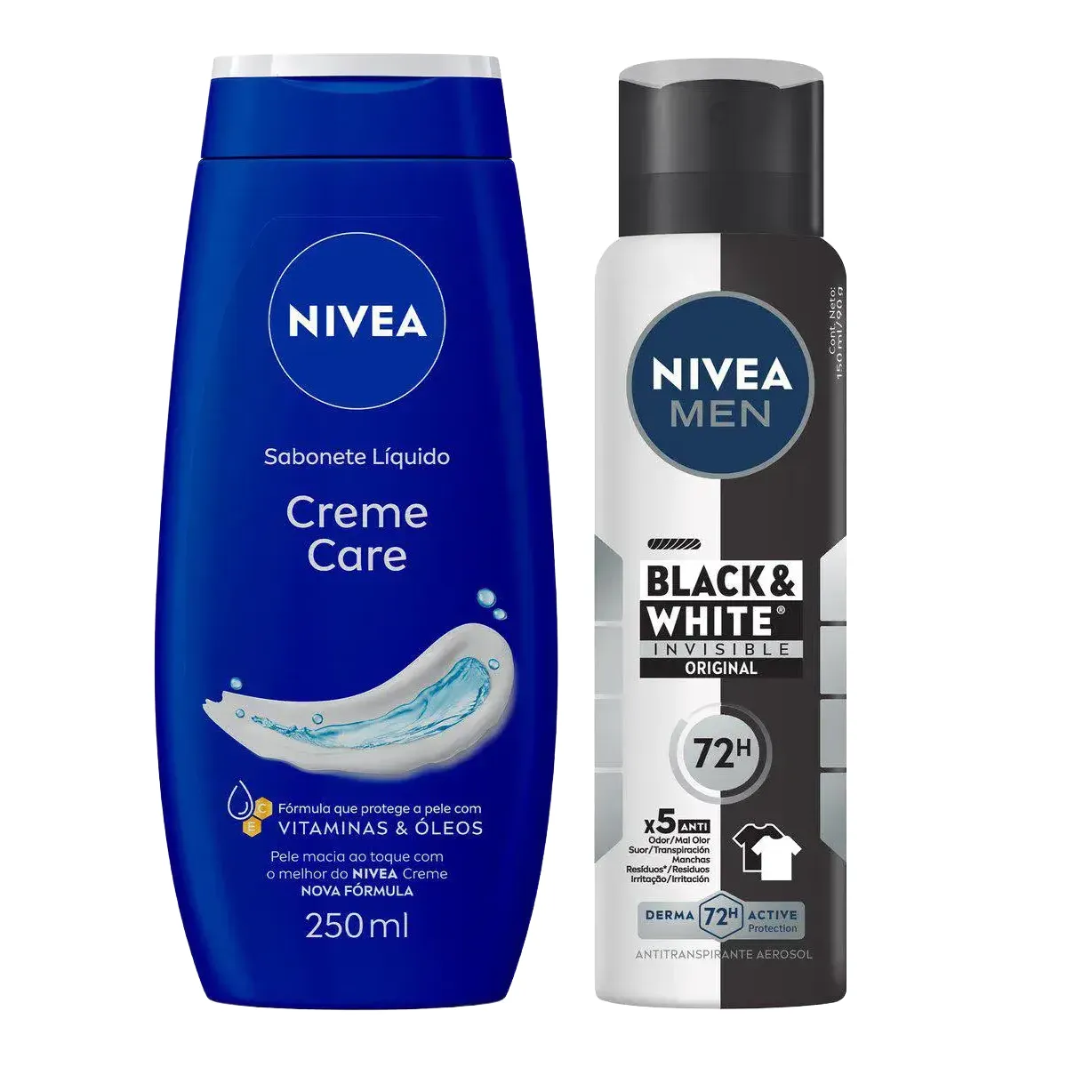 Kit Nivea Desodorante Antitranspirante Aerosol Men Black & White Invisible 72h 150ml + Sabonete Líquido Creme Care 250ml é um conjunto que oferece proteção antitranspirante por até 72 horas, além de uma fórmula poderosa antibacteriana que elimina 99,99% das bactérias causadoras do mau odor. O desodorante possui uma tecnologia inovadora que protege as fibras dos tecidos, evitando manchas brancas nas roupas e o surgimento de manchas amarelas. O sabonete líquido corporal Nivea Creme Care, por sua vez, proporciona limpeza e hidratação intensa, deixando a pele macia, suavemente perfumada e revigorada.