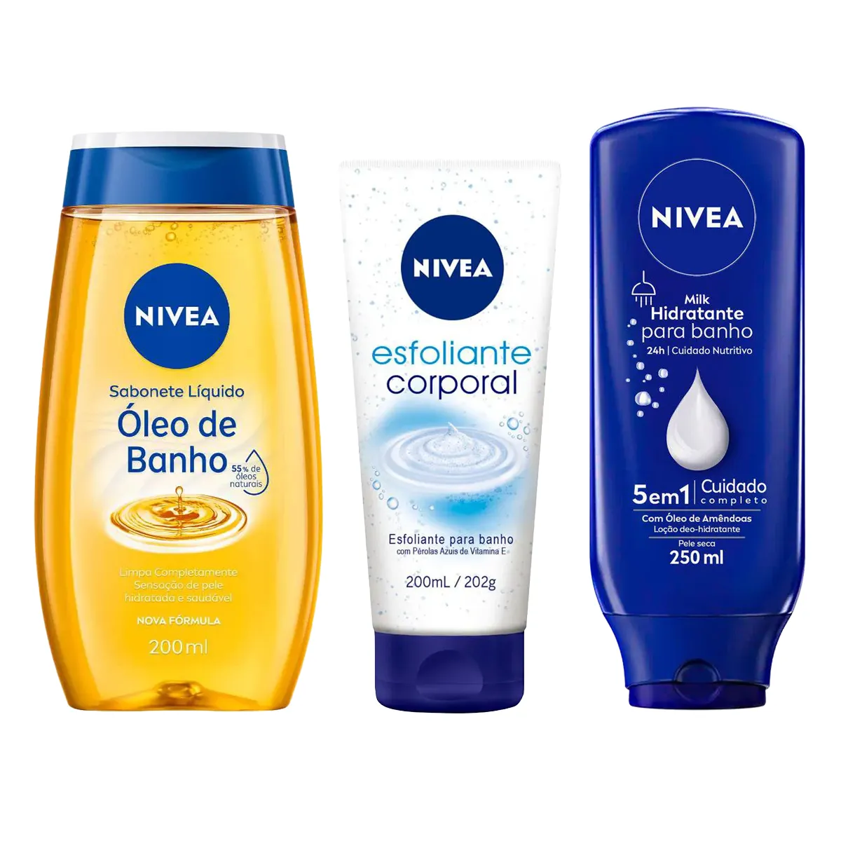 Kit Nivea Sabonete Líquido Corporal Óleo de Banho 200ml + Esfoliante Corporal para Banho 200ml + Hidratante Desodorante para Banho Milk 250ml