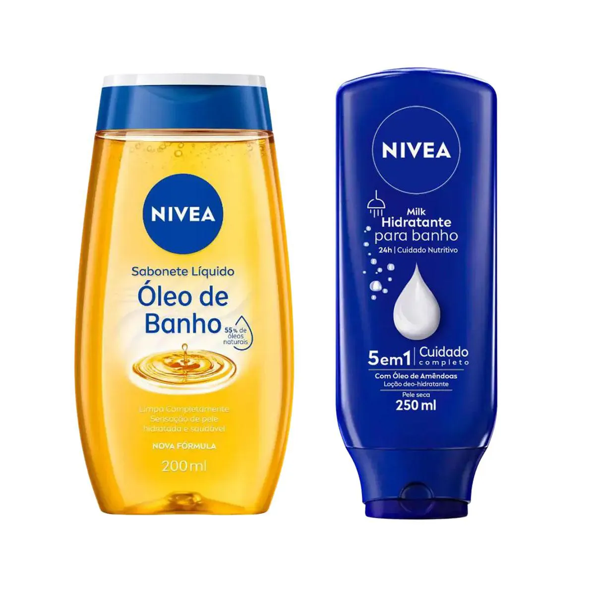 O Kit Nivea Sabonete Líquido Corporal Óleo de Banho + Hidratante Desodorante para Banho Milk é um conjunto de produtos de cuidado corporal que promovem limpeza, hidratação e perfume durante o banho. O Nivea Óleo de Banho é um sabonete líquido que limpa suavemente a pele, deixando-a mais macia e hidratada, enquanto o Hidratante Desodorante para Banho Nivea Milk hidrata intensamente o corpo, com rápida absorção e ação desodorante, dispensando a necessidade de aplicar outro hidratante após o banho.