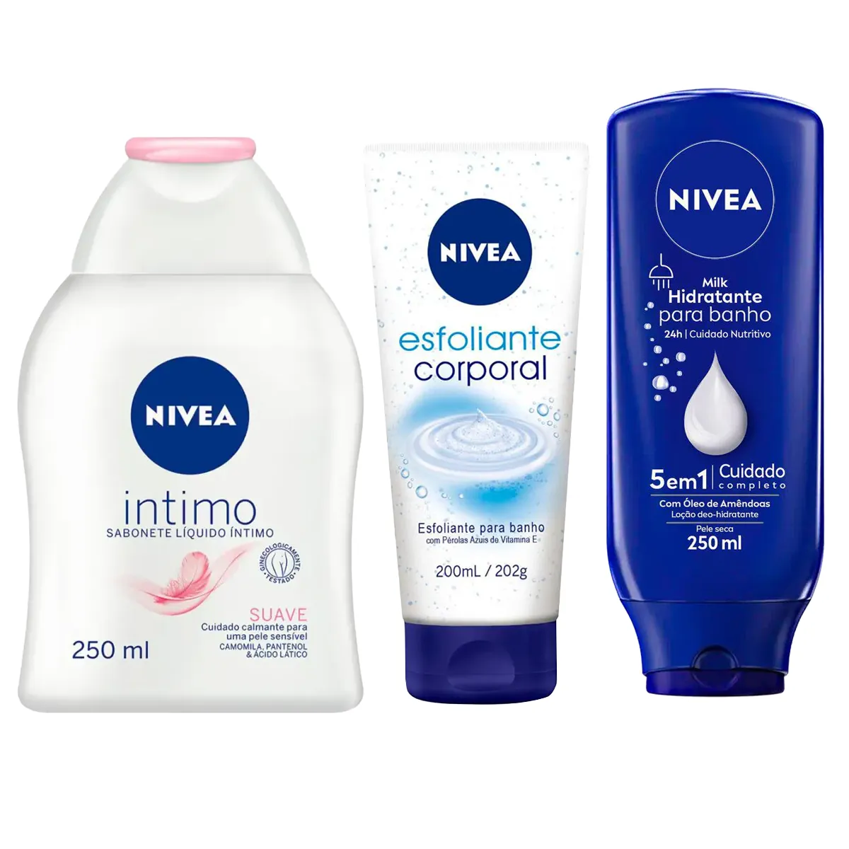 Kit Nivea Sabonete Líquido Íntimo Suave 250ml + Esfoliante Corporal para Banho 200ml + Hidratante Desodorante para Banho Milk 250ml
