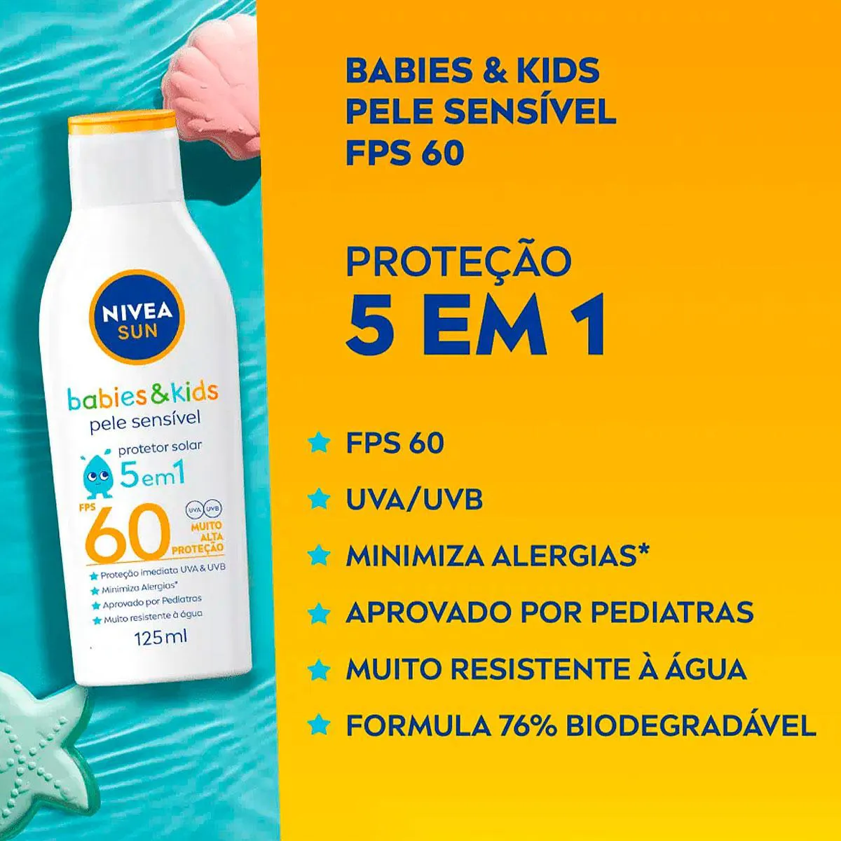 Este Kit Contém Nivea Sun Protect & Hidrata FPS 50 - Protetor Solar 200ml: apresenta um sistema de filtro solar, que confere proteção UVA e UVB, e previne o envelhecimento da pele. Sua fórmula inovadora combina hidratação intensa e proteção altíssima contra raios solares. Nivea Sun Kids Sensitive FPS 60 infantil - Protetor Solar 125ml: traz alta proteção imediata dos raios UVA e UVB, para crianças. Formulado para peles extremamente sensíveis ao sol, minimiza o surgimento de possíveis alergias e é resistente à água.Conselho de Aplicação