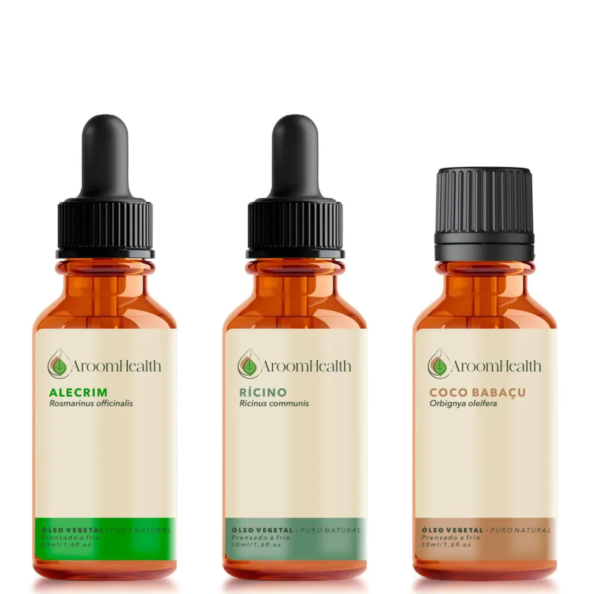 Kit óleos vegetais de Alecrim, Coco Babaçu e Rícino - 30 ml cada AroomHealth. kit de óleos vegetais puro natural prensado a frio sem nenhum ativo químico de Alecrim, Coco babaçu e Rícino . Hidratação profunda, reparação dos fios e estímulo ao crescimento saudável. Indicado para todos os tipos de cabelo, especialmente os que precisam de brilho, força e recuperação. Óleo vegetal de Alecrim: Estimula a circulação sanguínea no couro cabeludo, favorecendo o crescimento capilar e ajudando a manter os fios fortes e saudáveis. Também combate os danos causados por radicais livres. Óleo vegetal de Coco Babaçu : Leve e altamente nutritivo, penetra facilmente na fibra capilar, sela a umidade natural dos fios e suaviza as cutículas. Ideal para reduzir a quebra, promover brilho e melhorar a saúde geral do cabelo. Pode solidificar em temperaturas baixa, sendo necessário colocar em banho maria para voltar estado líquido. Óleo vegetal de Rícino :Rico em ácido ricinoleico, tem propriedades anti-inflamatórias e antimicrobianas. Equilibra a oleosidade, previne infecções no couro cabeludo e combate o ressecamento e a quebra dos fios. Obs: O óleo vegetal de coco babaçu em temperaturas baixa pode solidificar ( endurecer),necessário aquecer em banho maria, esse processo não interfere nas popriedades natural do óleo. Características do Produto: Produto vegano, sem testes em animais. Embalagem em vidro âmbar com conta-gotas. Óleo de Coco Babaçu em vidro âmbar sem conta gota Validade de 2 anos (verifique no rótulo). Óleos vegetais são gorduras extraídas das plantas na maioria o aroma é semelhando a de um óleo comum. Modo de uso: Umectação Capilar: Misture 1 colher de sopa de cada óleo e aplique no couro cabeludo e pontas, com cabelo seco ou molhado. Cubra com touca e deixe agir por 30 a 45minutos . Para umectação noturna a mesma dosagem , proteja o travesseiro com toalha escura e pela manhã lavar retirando todo excesso do produto. Hidratação com Máscara capilar : Adicione 1 colher de chá de cada óleo em 100g da sua máscara favorita. Aplique e masageie bem ,cubra com touca e deixe agir por 30 a 45 minutos. *Confira nas fotos do anúncios mais formas de uso. Precauções: Armazene em local fresco, longe da luz e fora do alcance de crianças e animais. Gestantes e lactantes consultar médico antes do uso. Havendo sensibilidade ao produto, suspender o uso. USO EXTERNO.