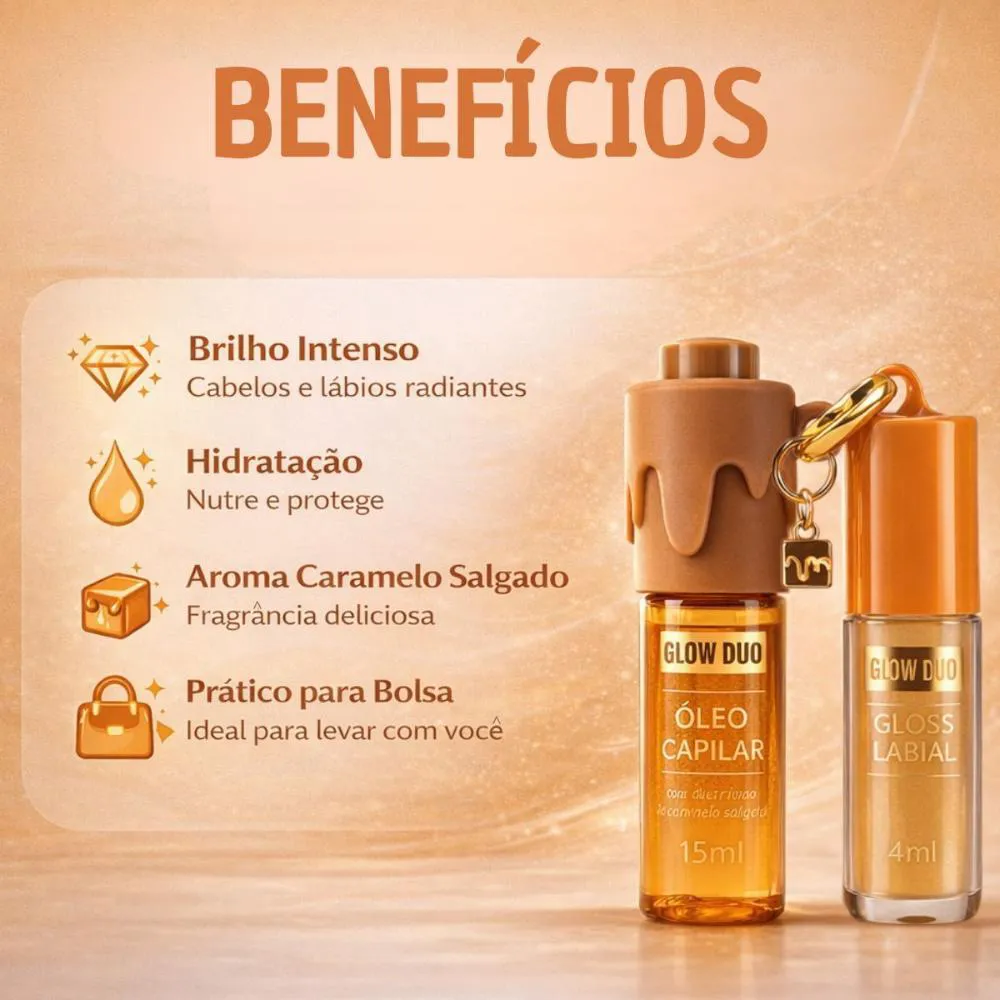 O Kit Contém: - 1 Óleo Capiar Cheirinho de Caramelo Salgado 15ml - 1 Gloss Labial Cheirinho de Caramelo Salgado 4ml