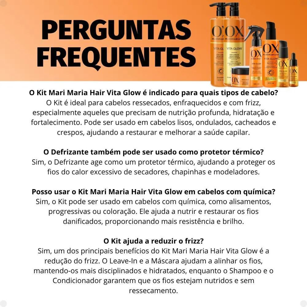 Contém: - 01 shampoo Mari Maria Hair Ox Vita Glow 500ml. - 01 condicionador Mari Maria Hair Ox Vita Glow 500ml. - 01 Máscara de Tratamento Mari Maria Hair Ox Vita Glow 190g. - 01 Sérum Reconstrutor Mari Maria Hair Ox Vita Glow 110ml. - 01 Defrizante Mari Maria Hair Ox Vita Glow 200ml. - 01 Óleo Reparador 3 em 1 Mari Maria Hair Ox Vita Glow 60ml. - 01 Tônico Fortalecedor Mari Maria Hair Ox Vita Glow 30ml. . Kit Mari Maria Hair Vita Glow A Linha MARI MARIA HAIR VITA GLOW é a ideal para cabelos ressecados e enfraquecidos. Isso porque a combinação do blend de óleos ricos em vitaminas* A, C, D, E, complexo B, ômega 3 e 6 com o Sistema OX Beleza Duradoura, é a fórmula certa para nutrir os fios auxiliando no crescimento saudável dos cabelos. Sistema OX Beleza Duradoura: É uma tecnologia exclusiva, capaz de liberar sequencialmente os ingredientes, proporcionando um tratamento prolongado aos fios. . Modo de Uso Shampoo: Aplique o Shampoo nos cabelos molhados massageando-os por alguns minutos. Enxágue e repita a aplicação. Condicionador: Após lavar o cabelo com Shampoo, aplique o Condicionador nos cabelos ainda molhados do comprimentos às pontas. Deixe agir por alguns minutos e, em seguida enxágue. Máscara: Após o uso do Shampoo, aplique a Máscara mecha a mecha deixe agir por 5 minutos e enxágue. Sérum: Utilize nos cabelos úmidos antes do uso de ferramentas de calor. Defrizante: Aplique o Defrizante no comprimento e pontas dos fios, úmidos ou secos para realizar o controle do frizz e selamento de pontas. Pode ser utilizado como protetor térmico antes de ferramentas de calor. Óleo: Aplique o produto sempre que necessário nos cabelos úmidos ou secos. Não é necessário enxáguar. Tônico: Agite antes de usar. Com os cabelos úmidos ou secos, aplique o Tônico diretamente no couro cabeludo. Massageie o couro cabeludo suavemente com os dedos, em movimentos circulares. Não é necessário enxáguar. . Código de Registro Sanitário (ANVISA) Shampoo: 25351.405227/2023-93 Condicionador: 25351.405208/2023-67 Máscara: 25351.405047/2023-10 Sérum: 25351.401856/2023-44 Defrizante: 25351.363385/2024-40 Óleo: 25351.402042/2023-27 Tônico: 25351.405129/2023-56