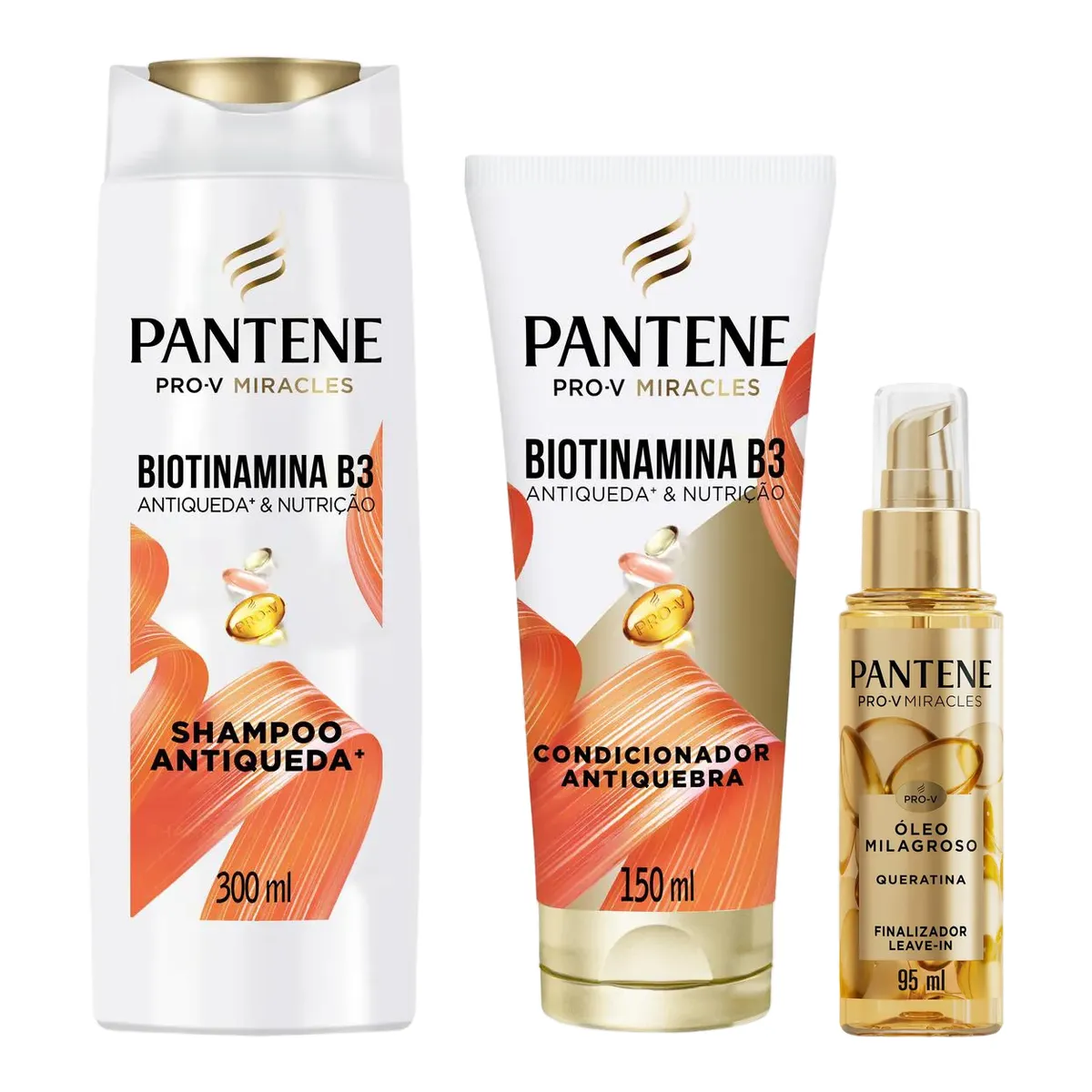 Kit Pantene Biotinamina B3 Antiqueda & Nutrição Shampoo 300ml + Condicionador 150ml + Óleo Milagroso Finalizador Leave-in Queratina 95ml