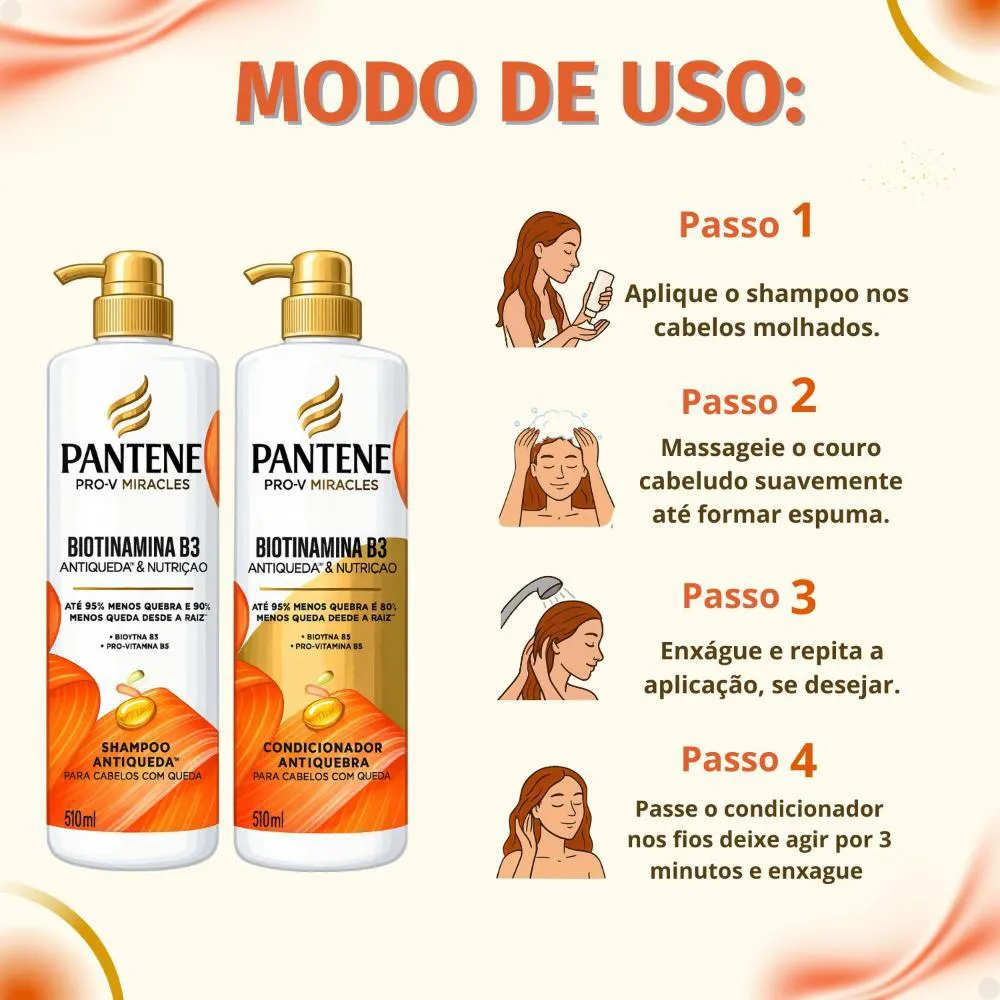 Shampoo: Aplique o Shampoo Pantene Pro-V Miracles Biotinamina B3 sobre o cabelo molhado, massageie suavemente o couro cabeludo e os fios até formar espuma. Enxágue bem.Condicionador: Após lavar com o shampoo, aplique o Condicionador Pantene Pro-V Miracles Biotinamina B3 do meio às pontas dos cabelos. Deixe agir por alguns minutos e enxágue completamente.Shampoo: 25351.175055/2024-07 Condicionador: 25351.174944/2024-49
