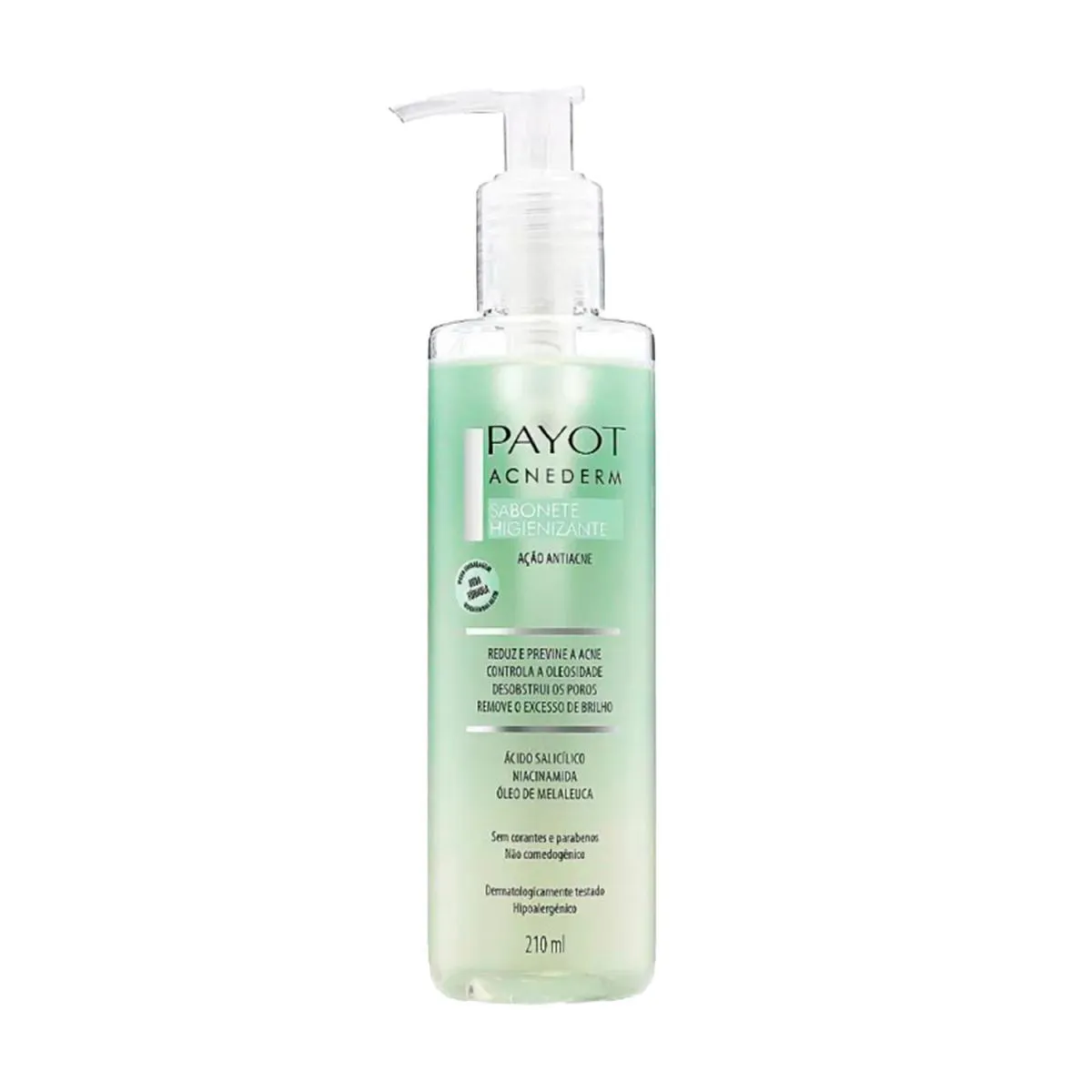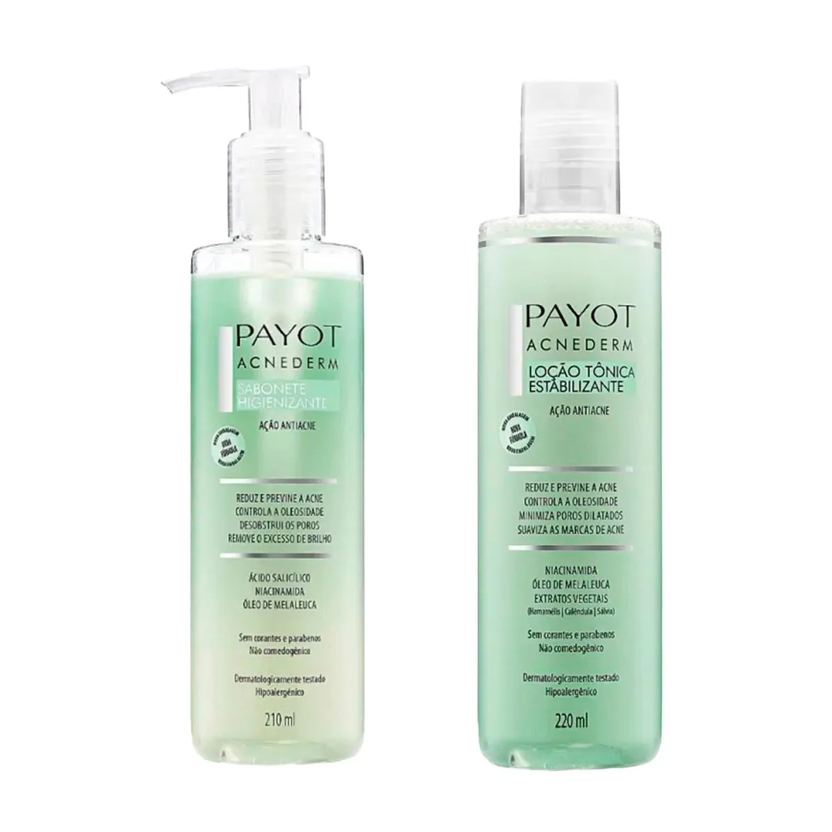 O sabonete Higienizante Acnederm Payot, foi formulado com Ácido Salicílico, Niacinamida e Óleo de Melaleuca, que conferem limpeza profunda eliminando as impurezas, sem irritar ou ressecar a pele. A Loção Tônica Estabilizante Acnederm Payot auxilia na redução da acne e previne a formação de novas espinhas. Possui ação adstringente e refrescante que limpa profundamente e controla a oleosidade ao longo do dia. Não resseca a pele. Sua fórmula enriquecida com Extratos Vegetais, Óleo de Melaleuca e Niacinamida minimiza os poros dilatados, combate a vermelhidão, suaviza as marcas de acne e acalma a pele. Controla a oleosidade excessiva, deixando a pele limpa e hidratada ao longo do dia. Desobstrui os poros. Diminui a vermelhidão e o inchaço causado pela acne. Seu uso contínuo ajuda na prevenção de formação de cravos e espinhas.