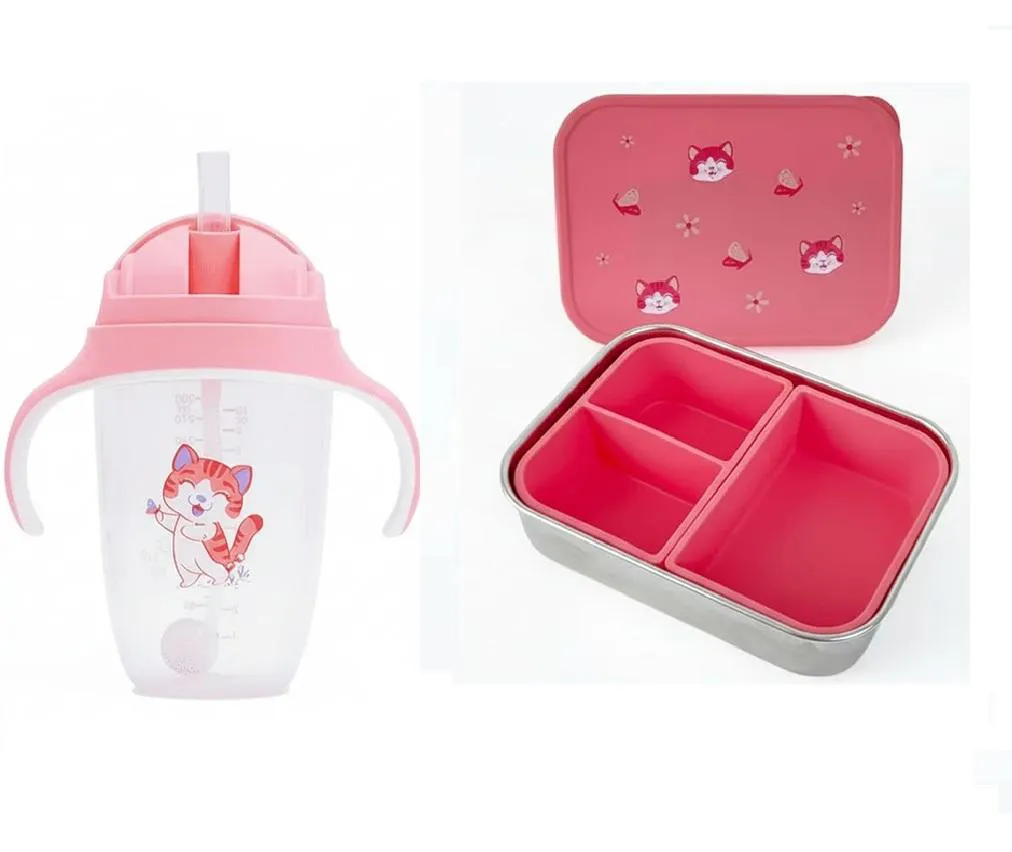 Kit Petit Piá Copo de Treinamento com Canudo 300Ml + Bento Box em Aço Inox com Divisórias Silicone