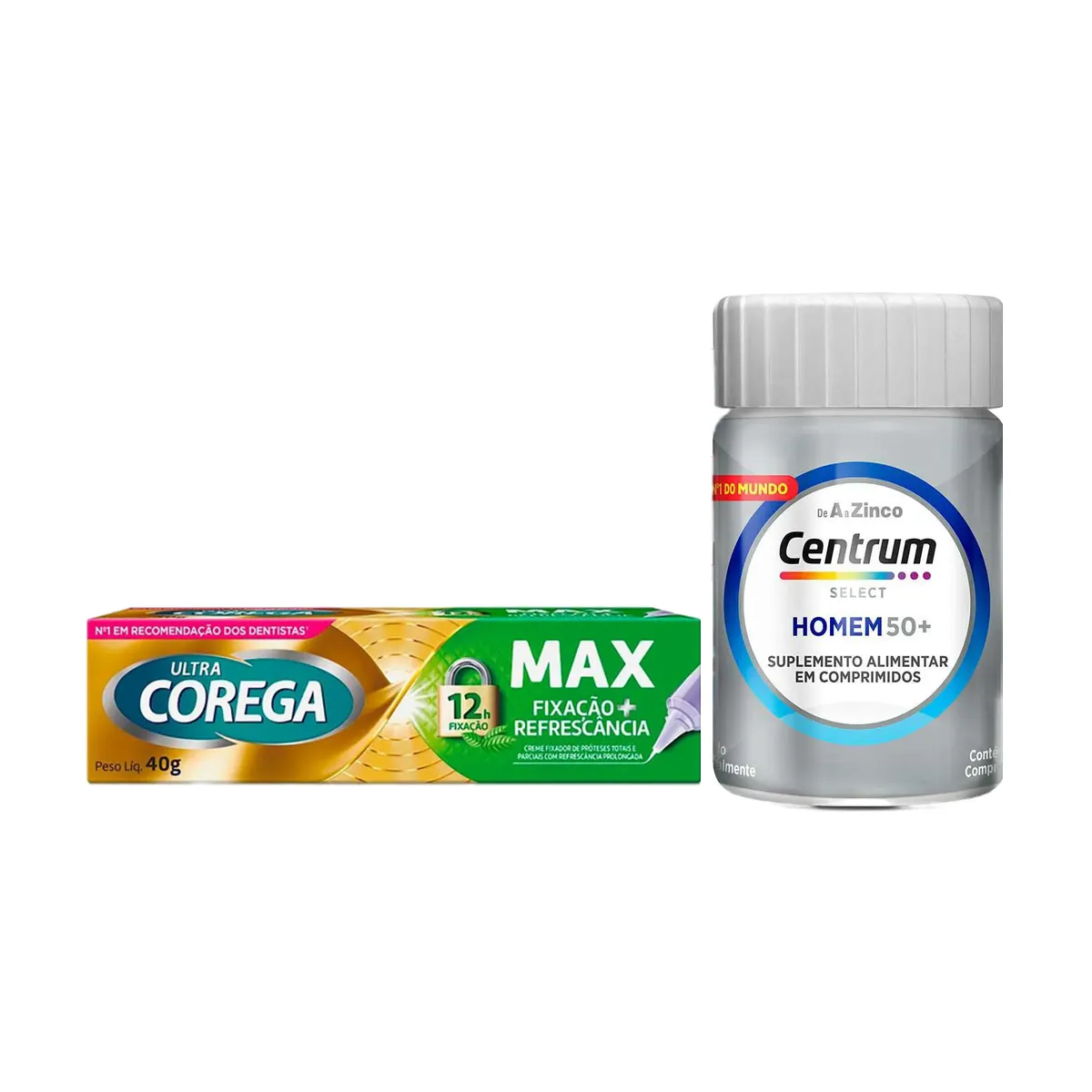 Kit Polivitamínico Centrum Select Homem 30 comprimidos + Creme Fixador de Dentadura Ultra Corega Max Fixação e Refrescância Menta 40g