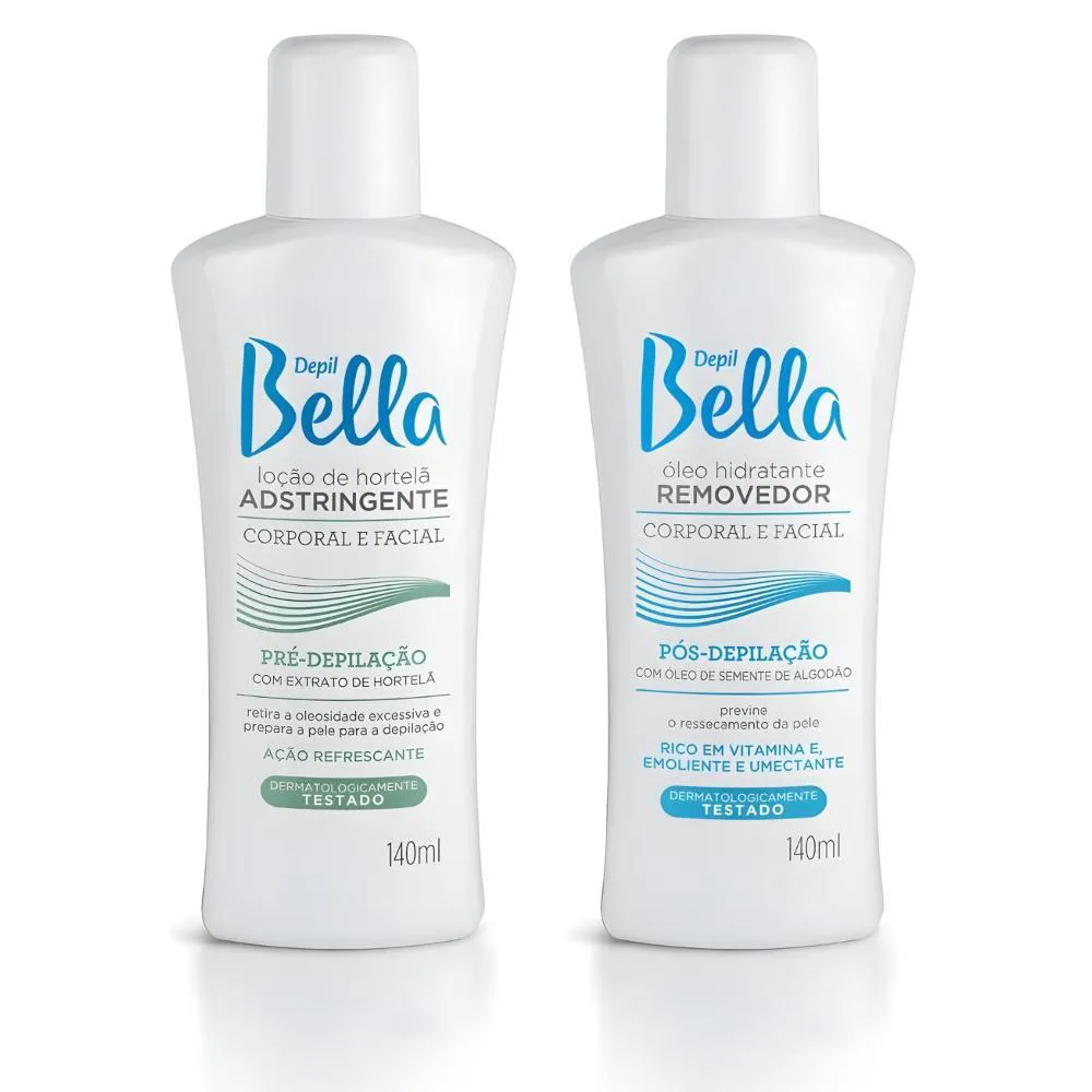 Mais eficiência e cuidado completo antes e depois da depilação, garantindo melhor preparo da pele e remoção prática de resíduos, com sensação de limpeza e conforto. Este kit reúne dois itens essenciais para rotinas profissionais e domésticas, ajudando a otimizar o procedimento e melhorar o acabamento final.A Loção Adstringente Depil Bella é ideal para ser utilizada antes da depilação, auxiliando na higienização da pele e na remoção de oleosidade excessiva. Essa etapa é fundamental para melhorar a aderência da cera e favorecer uma depilação mais eficaz, contribuindo para um resultado mais uniforme e duradouro.Já o Óleo Removedor Depil Bella é perfeito para o pós-depilação, ajudando a remover resíduos de cera com facilidade e sem agredir. Sua ação facilita a limpeza da pele após o procedimento, proporcionando toque mais macio e sensação agradável, além de auxiliar no acabamento final da depilação.Esse kit é indispensável para quem busca uma rotina de depilação mais completa, prática e profissional, sendo indicado para uso em salões, clínicas de estética e também em casa.