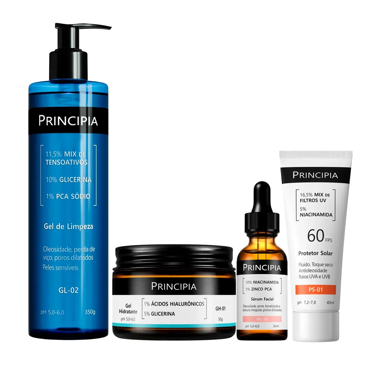 Kit Principia Gel de Limpeza Suave GL-02 350g + Gel Hidratante GH-01 50g + Sérum Facial Anti-Idade NC-10 30ml + Protetor Solar PS-01 FPS60 40ml