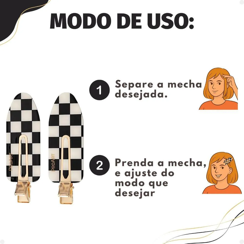 Basta posicionar a presilha na franja ou nas laterais do cabelo, prendendo os fios que deseja afastar do rosto.Para remover, puxe suavemente a presilha sem repuxar os fios, garantindo que não haja marcas.