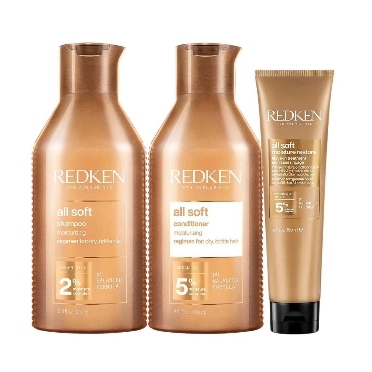 O Kit Redken All Soft Shampoo + Condicionador + Leave-in é um conjunto de produtos desenvolvidos especialmente para cabelos secos e opacos. O Shampoo Redken All Soft limpa e hidrata profundamente, com Moisture Complex e óleo de argan em sua composição. O Condicionador Redken All Soft, enriquecido com óleo de argan, tem o objetivo de hidratar intensamente, trazendo maciez e brilho aos fios. Já o Leave-in Redken Moisture Restore hidrata profundamente e adiciona brilho instantâneo, com Ácido Hialurônico em sua fórmula.