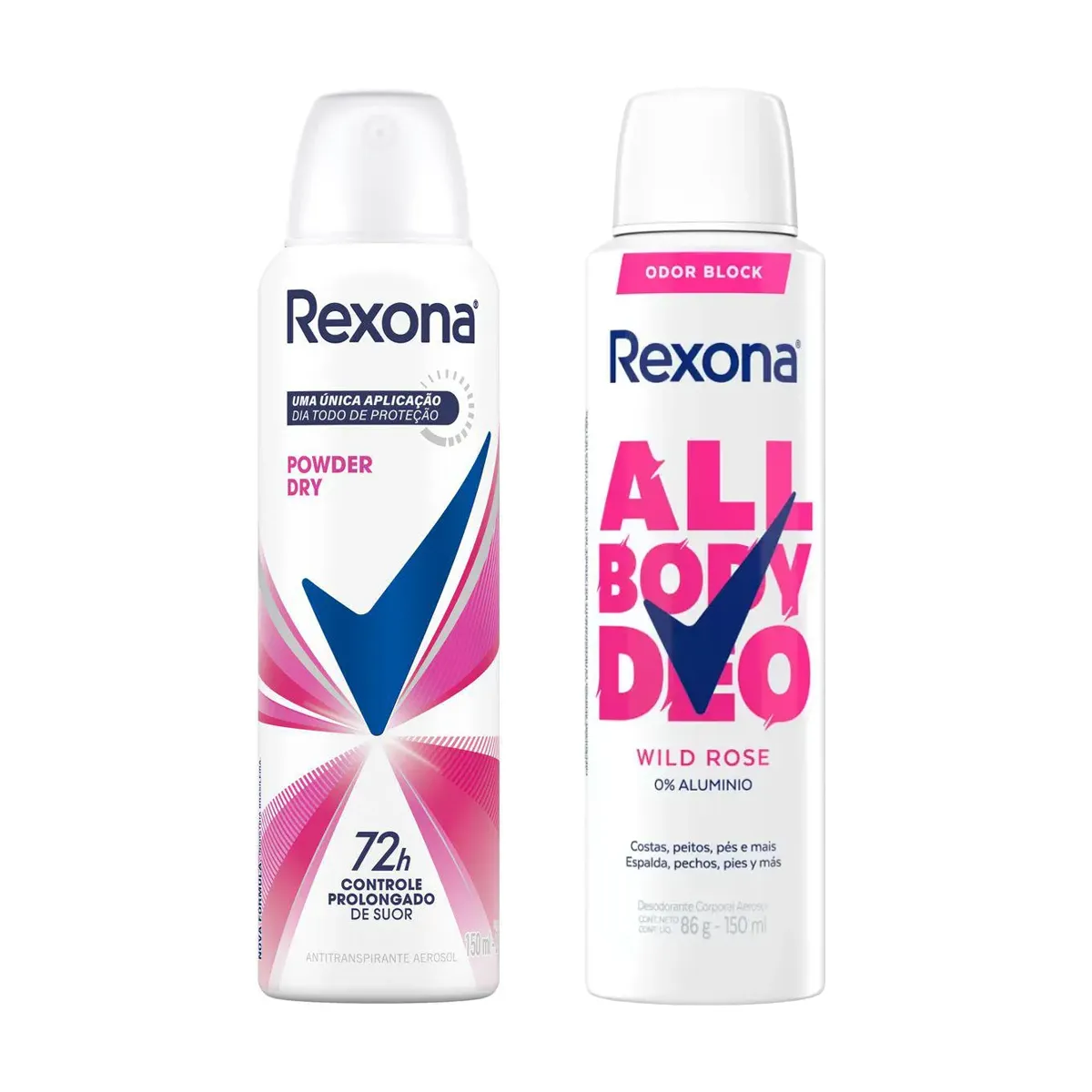 Kit Rexona Desodorante Antitranspirante Aerosol Powder Dry Feminino 72h 150ml + Desodorante Corporal Aerosol All Body Deo Wild Rose 150ml