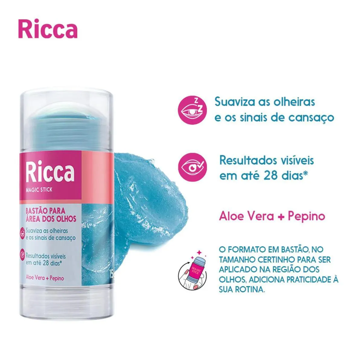 O Bastão Ricca para Área dos Olhos foi desenvolvido para hidratar, refrescar e melhorar a circulação na região dos olhos, reduzindo olheiras e sinais de cansaço. Contém aloe vera e extrato de pepino, que suavizam bolsas e proporcionam um olhar mais descansado.