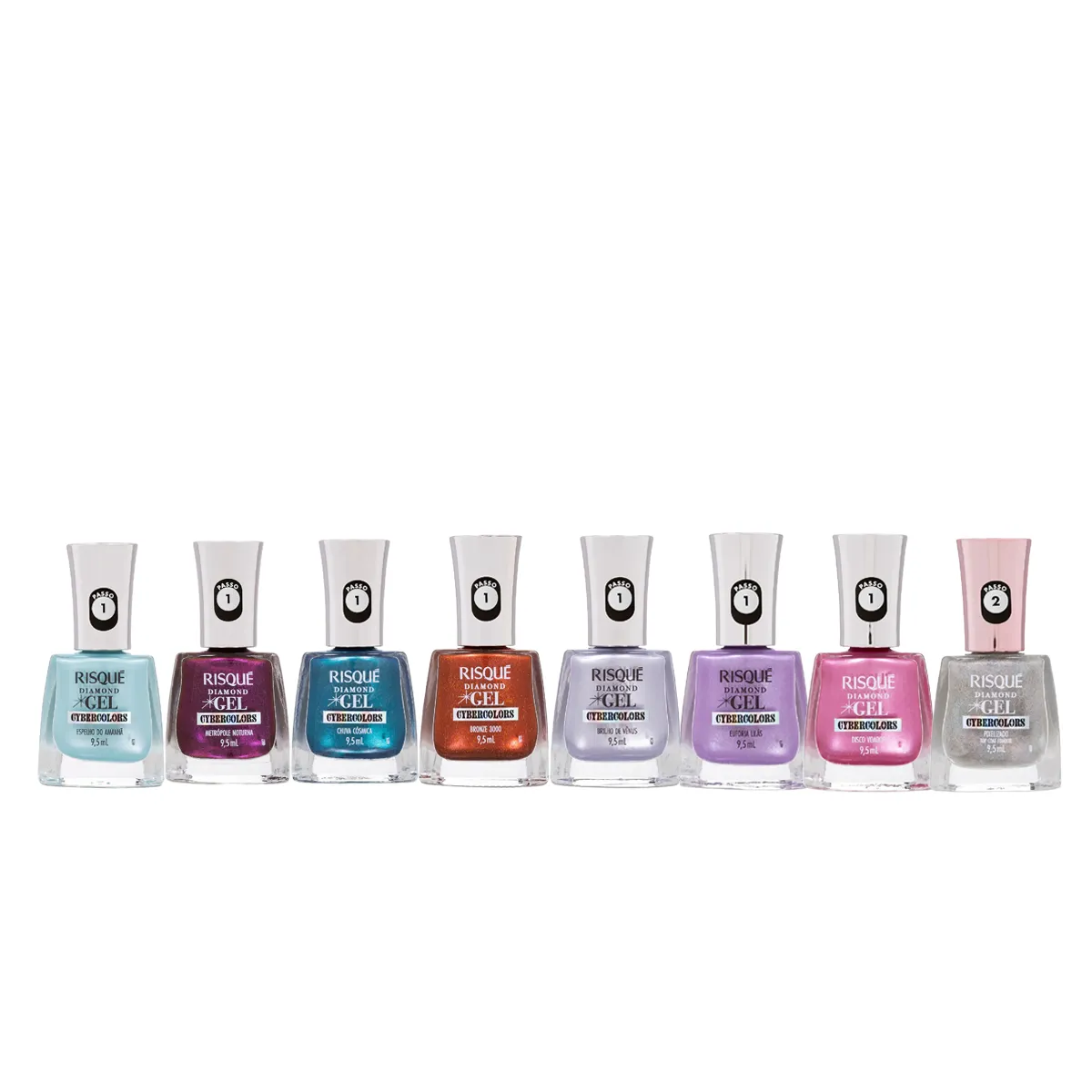 O Kit Risqué Diamond Cybercolors Brilho de Venus + Bronze 3000 + Chuva Cósmica + Metrópole Noturna + Espelho do Amanhã + Euforia Lilás + Disco Voador + Top Coat Pixelizado é um conjunto completo de esmaltes com efeito gel desenvolvidos para proporcionar brilho intenso, cores sofisticadas e maior durabilidade às unhas. A coleção reúne tonalidades metálicas e modernas, além de um top coat holográfico para finalização, com fórmulas hipoalergênicas e pincéis que facilitam a aplicação uniforme.