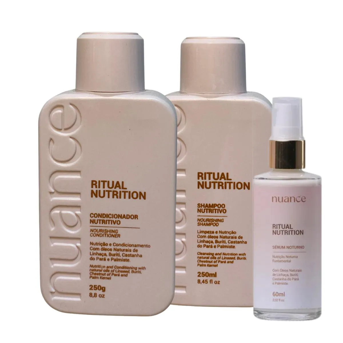 shampoo 1L + condicionador 250ml + Sérum Capilar Noturno 60ml Transforme sua rotina capilar com o Kit Ritual Nutrition Home Care da Nuance Professional. Especialmente desenvolvido para nutrir profundamente e restaurar a saúde dos fios, esse trio é ideal para cabelos secos, ressecados ou sensibilizados. O Shampoo Nutritivo limpa suavemente, removendo impurezas sem agredir ou ressecar. O Condicionador hidrata, desembaraça e sela as cutículas, proporcionando toque sedoso e brilho intenso. Para completar, o Sérum Capilar Noturno age durante o sono, nutrindo e revitalizando os fios enquanto você descansa — sem precisar enxaguar. Resultados visíveis desde as primeiras aplicações: