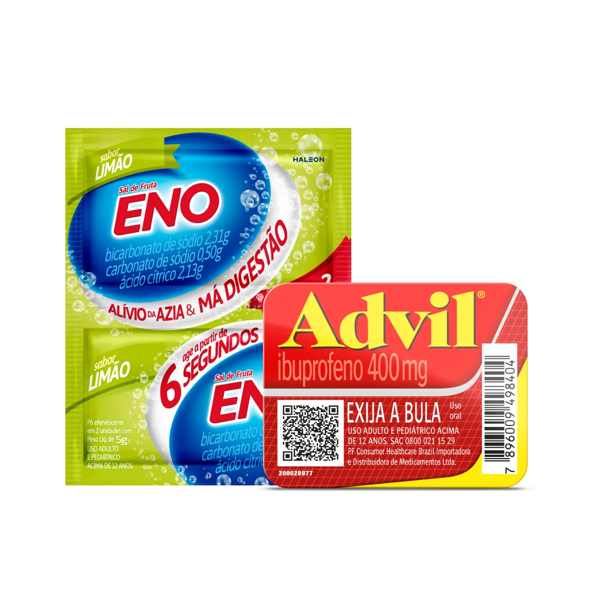 O Kit Eno Sal de Fruta Limão + Advil Ibuprofeno 400mg foi desenvolvido para proporcionar alívio rápido e eficaz de sintomas digestivos e dores do dia a dia. O Eno Sal de Fruta é um antiácido indicado para azia, má digestão e excesso de acidez estomacal, promovendo ação em segundos. O Advil contém Ibuprofeno 400mg, com efeito analgésico e anti-inflamatório, indicado para dores de cabeça, musculares, cólicas menstruais e febre. Um kit prático que reúne duas soluções confiáveis para bem-estar imediato.