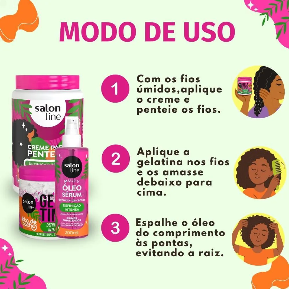 O Kit Salon Line Definição Intensa é perfeito para a sua rotina diária de cuidados capilares, seja para estilizar os fios após a lavagem ou para revitalizar os cachos no dia seguinte. É a escolha ideal para quem deseja manter a definição, o brilho e a saúde dos cabelos ondulados, cacheados e crespos em qualquer ocasião.Modo de Uso/Aplicação