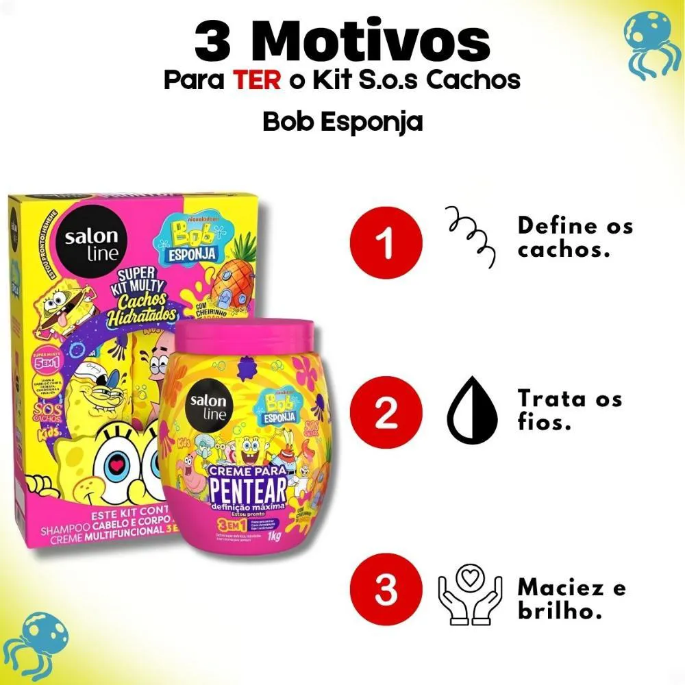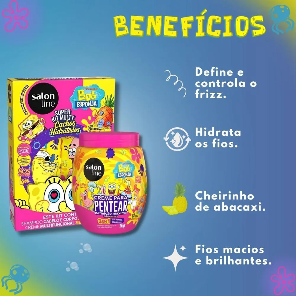 Kit Salon Line Kids Bob Esponja Sos Cachos: shampoo e Creme Multifuncional 300ml + creme para pentear 3 Em 1 1kg