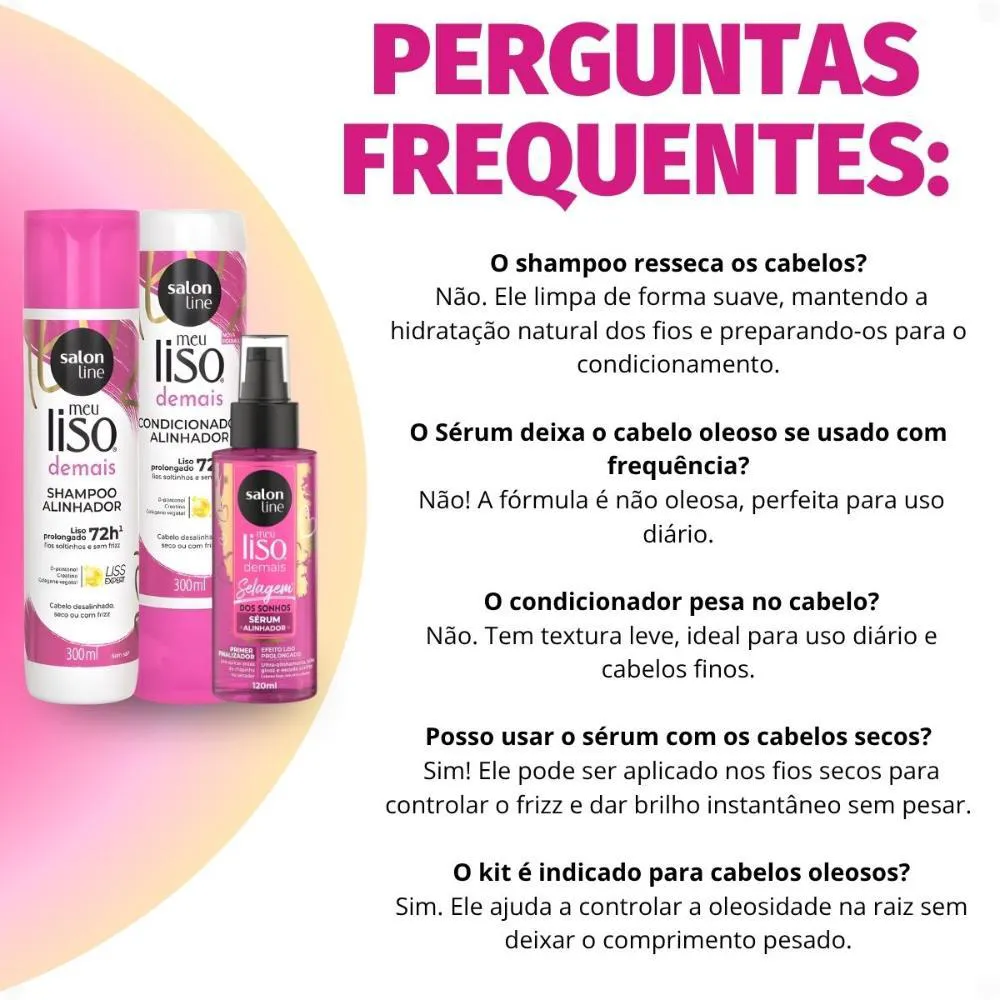 frizz com o Kit Salon Line Meu Liso Demais. Desenvolvido pela renomada marca SALON LINE, este kit completo é a solução ideal para quem busca um liso impecável, cuidando dos fios desalinhados, ressecados e com frizz. Composto por Shampoo, Condicionador 300ml e Sérum Alinhador Capilar 120ml, ele oferece um tratamento completo para transformar a