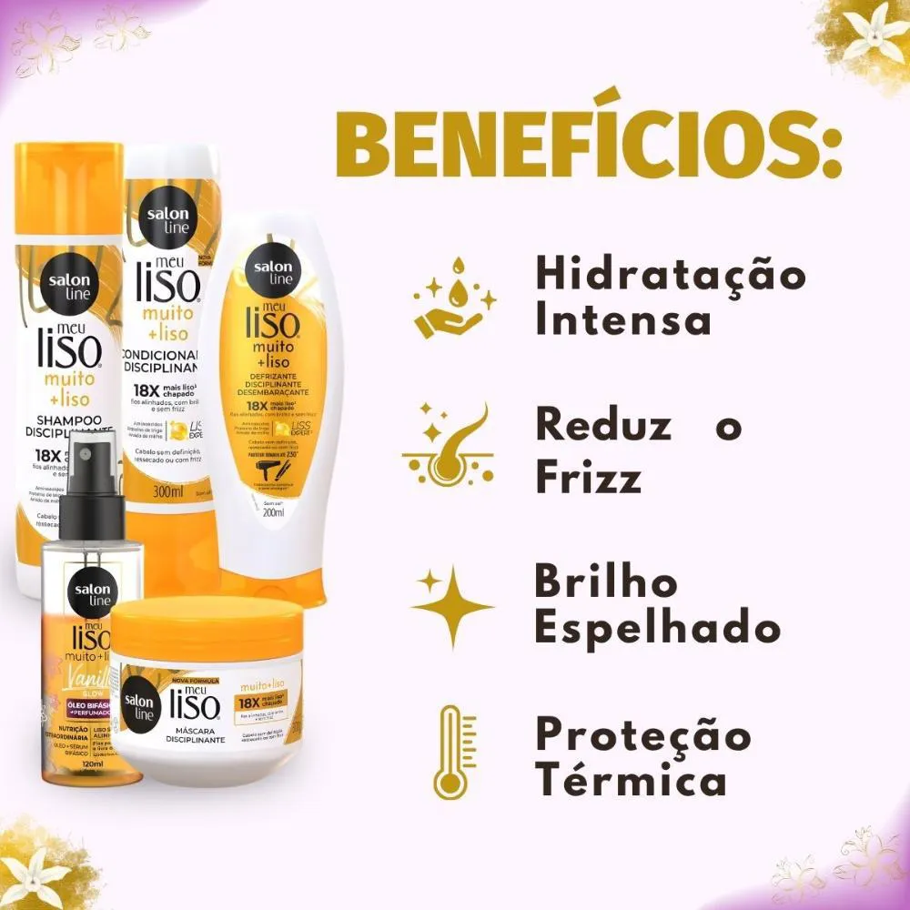 O Kit Salon Line Meu Liso Muito + Liso é ideal para o uso diário de quem possui cabelos lisos e deseja mantê-los sempre saudáveis, hidratados e com um liso impecável. Perfeito para quem busca um tratamento completo para controlar o frizz, aumentar o brilho e garantir o alinhamento dos fios em todas as ocasiões.Modo de Uso/Aplicação